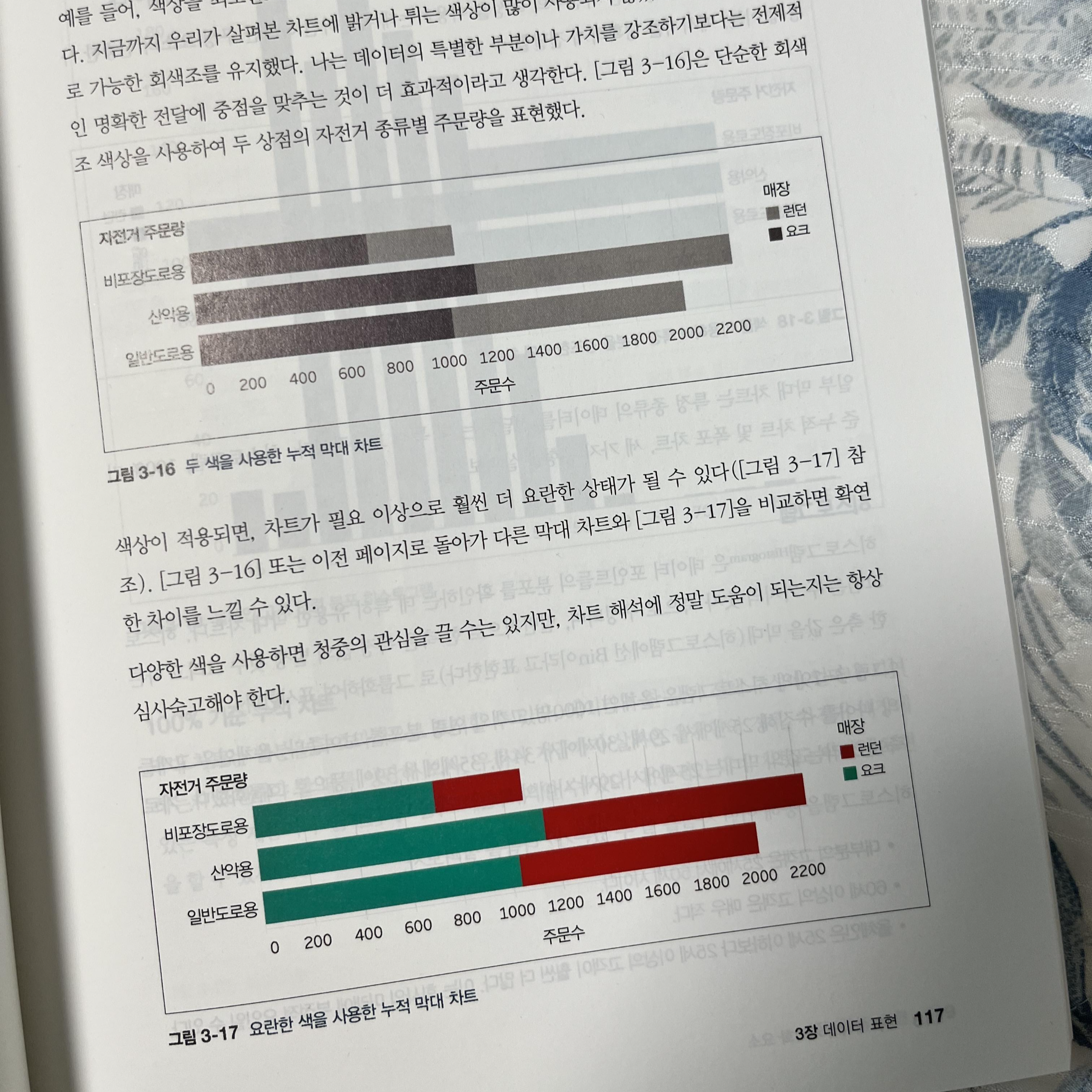 이 책에서는 이런 여러 과정들이 모두 포함되어 있다. 데이터를 비주얼라이즈 하는 여러 가지 방법을 보여주기도 하고 색에 관한 내용들도 나온다. 사실 나는 색이라는 것에 엄청 관심을 가지고 중요하다고 생각하는 사람인데, 그 내용을 다루고 있어서 좋았다.