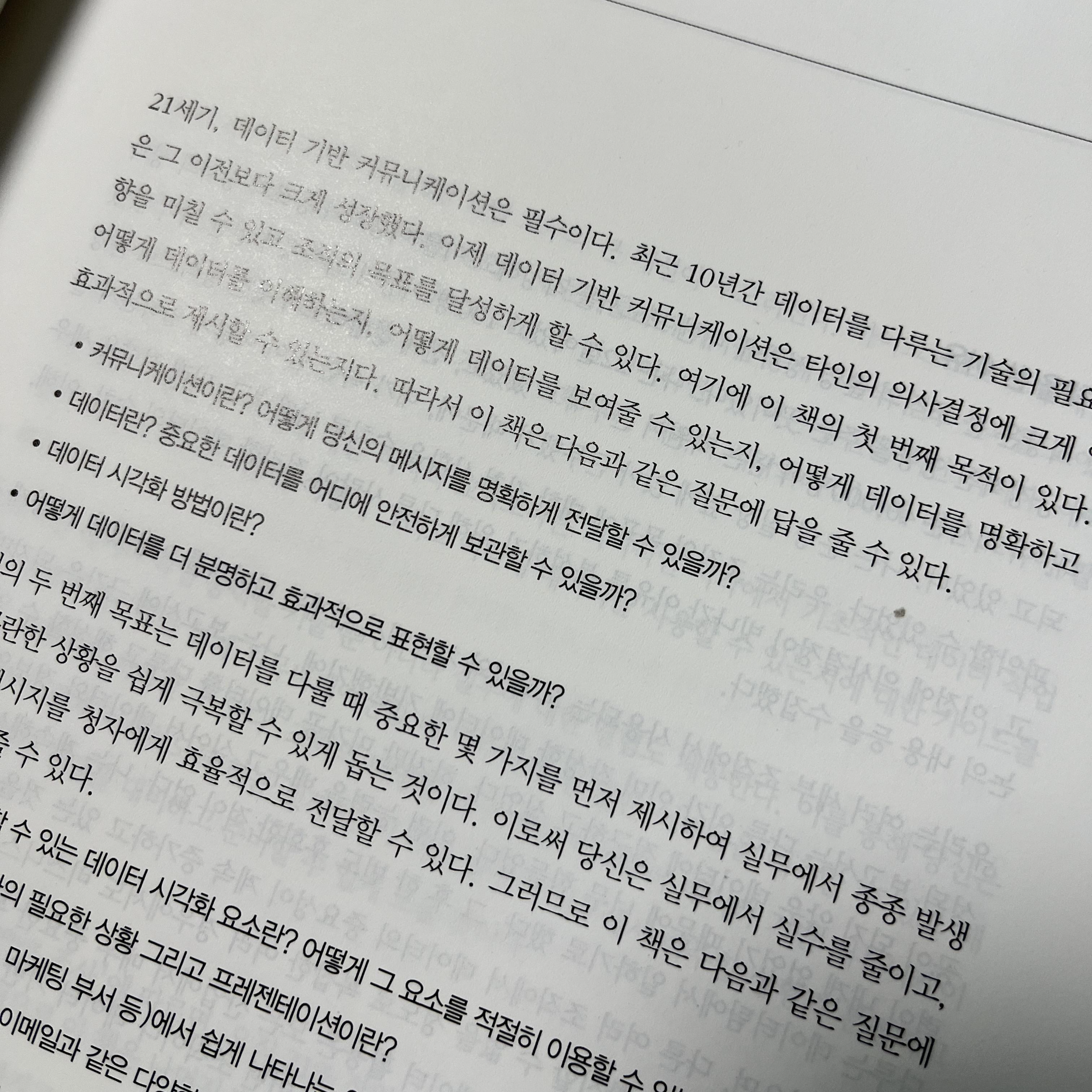 이 책에 대한 설명은 위와 같은데, 데이터 기반 커뮤니케이션이 이 책의 주제이다. 즉, 데이터를 바탕으로 어떤 의견을 어떻게 효과적으로 전달할 수 있을지에 대한 책이다. 이는 사실 연구에서 뿐 아니라 기업이나 대학 생활에서도 정말 정말 중요한 것일 테다.