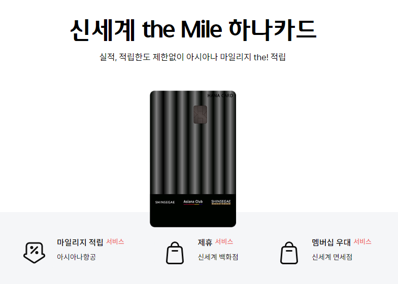 - 신세계 the Mile 하나카드 발급받았다. 신세계 백화점, 신세계 면세점, 아시아나 혜택이 있다.