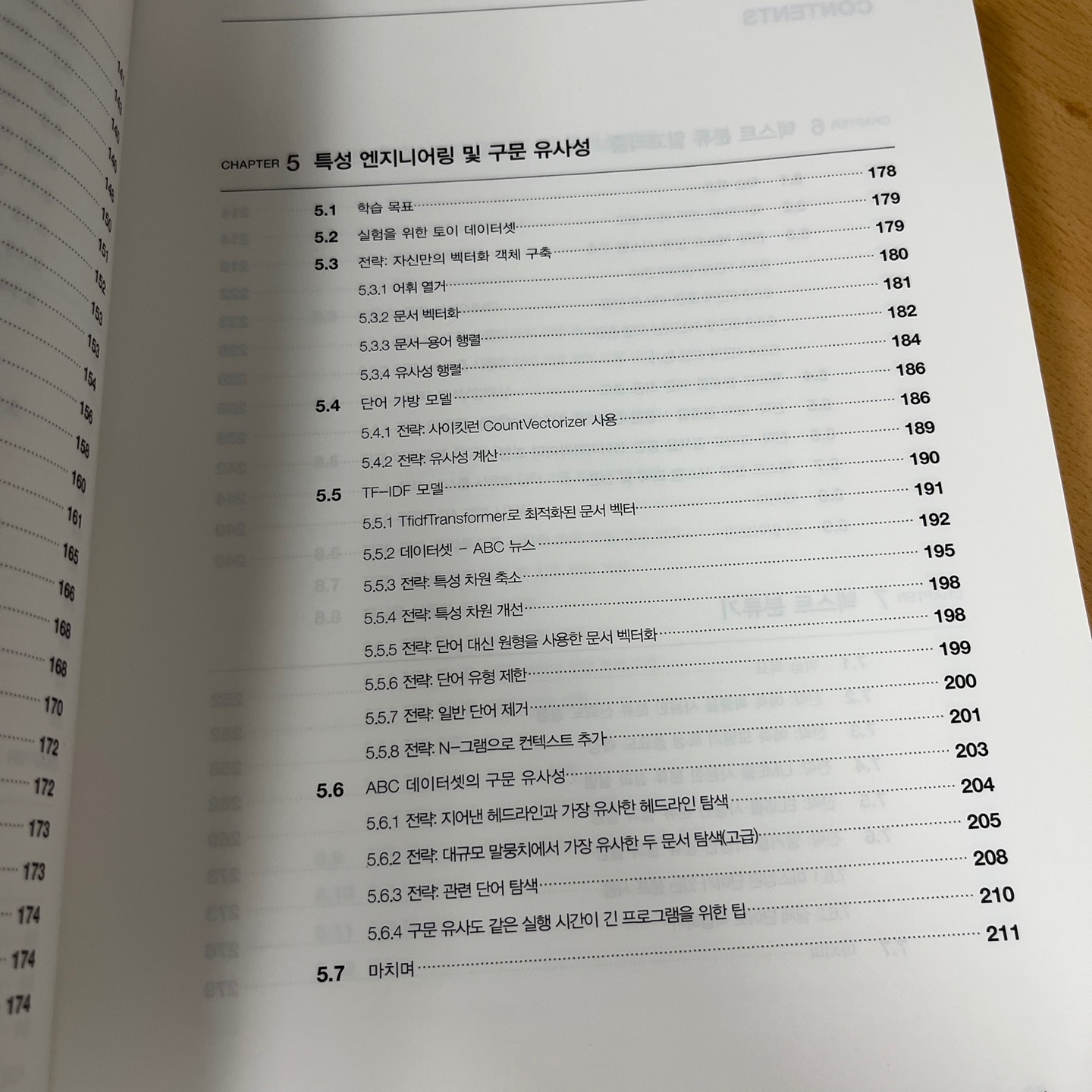 5번 목차 (특성 엔지니어링 및 구문 유사성)와 10번 목차 (단어 임베딩으로 의미 관계 탐색)에는 꽤 유용하고 읽을만한 내용들이 수록되어 있다. 특히, 임베딩은 머신 러닝에서 정말 유용하고 넓게 사용되는 개념인데, 임베딩의 정의부터 프리트레인 모델에서 얻은 임베딩 벡터를 기반으로 분석하는 방법을 소개한다. 임베딩을 이용해 데이터를 처리하는 것은 꼭 자연어 처리가 아니더라도 넓게 사용되는 기법이라 유용할 것이다.