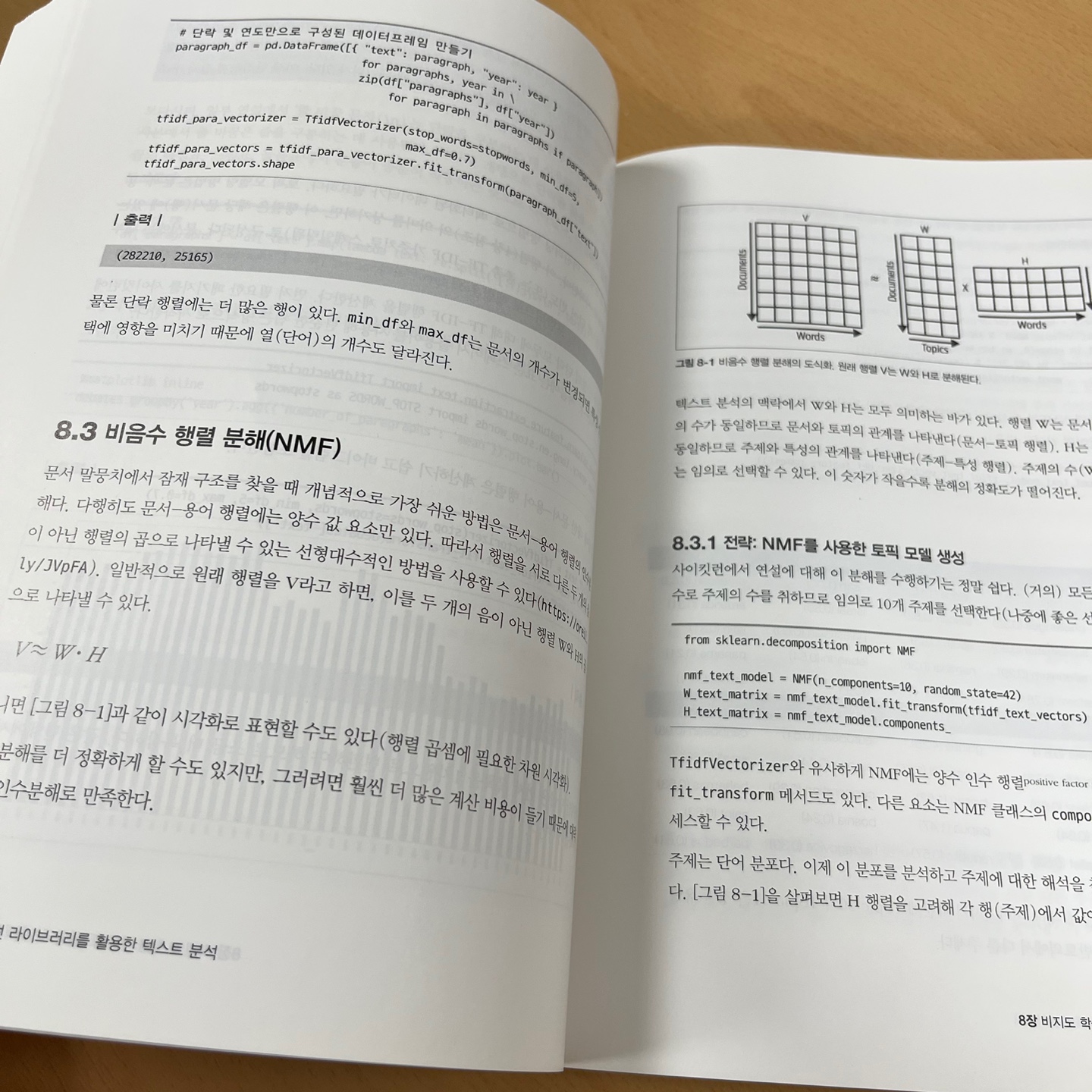 이 3개의 사진은 책을 읽다 보며 내가 반가워서 찍은 부분들이다. 나는 자연어 처리를 다루지는 않지만, 행렬 기반으로 수학적으로 뭘 좀 진행하다 보니 이런 개념들을 자주 보게 된다. 비음수분해 (NMF; Non-negative matrix factorization)의 경우에도 자연어처리에서 사용이 된다는 것은 알고 있었는데, 여기서 다시 마주했다.