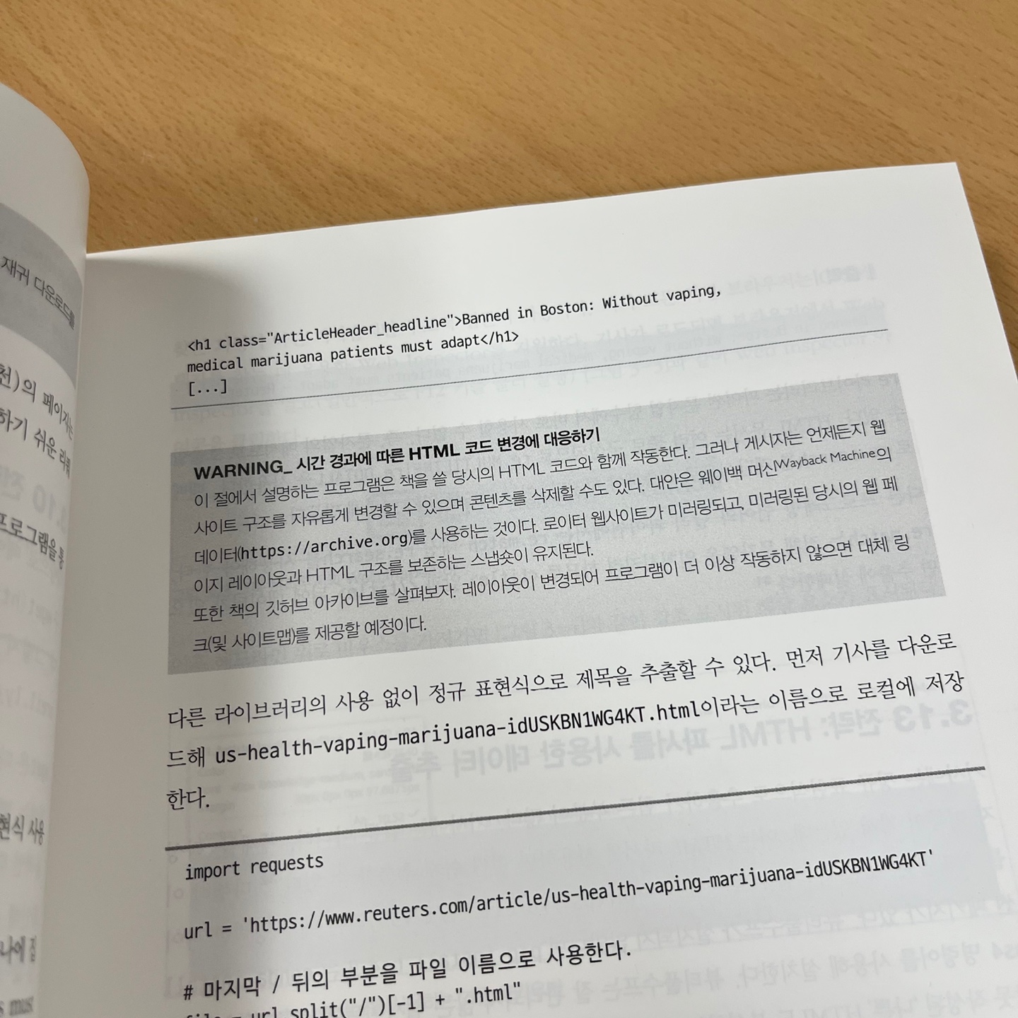 이런 와중 이 책을 받았다. 시의적절하다고 할 수 있다. 파이썬 라이브러리를 활용한 텍스트 분석이라는 책인데, 고난도 자연어처리까지는 아니지만 어떻게 텍스트 데이터를 컴퓨터를 활용하여 처리할 수 있는지 알려준다. 최신 머신 러닝 내용까지는 아니지만, LDA나 NMF와 같은 전통적인 분석 방식과 텍스트 임베딩 정도 수준까지 나온다. 사실 분석도 분석인데, 이 책 앞부분은 데이터를 어떻게 모을지, 어떤 식으로 다루는지에 대한 내용도 꽤 있다.