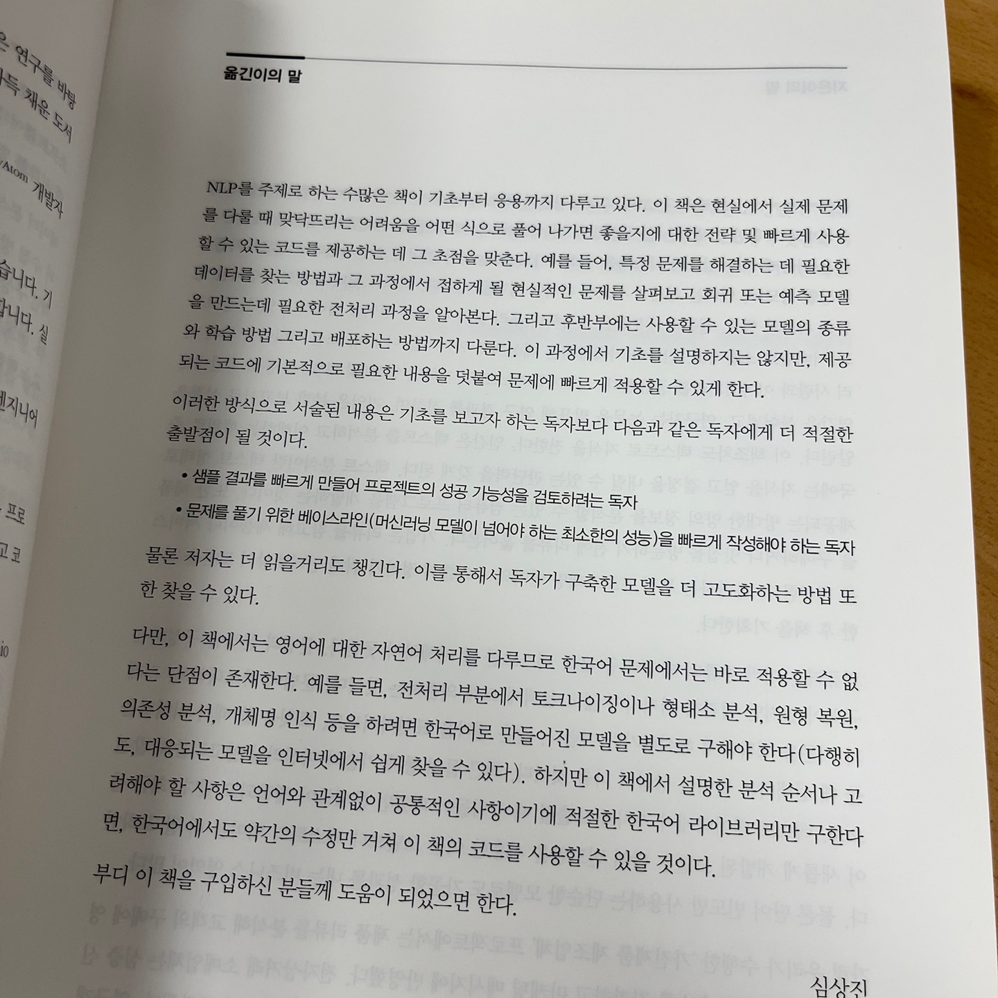 옮긴이의 말이 인사이트가 좀 있었다. 컴퓨터는 여러 종류의 데이터 중 텍스트를 가장 이해하기 어려워한다 하였고, 컴퓨터가 데이터를 잘 이해할 수 있도록 만드는 것은 결국 우리의 몫이다.