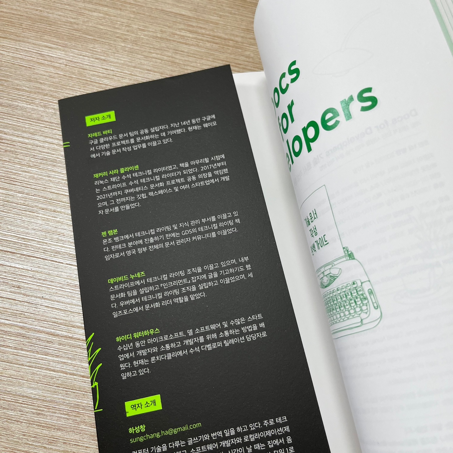 그러던 와중 이 책을 받았는데, 개발자들을 위한 책인 것 같다. 쌩 개발자들 사이에서는 저 문서화라는 것이 매우 중요하다고 하는데, 나도 어느 정도 관심만 가지고 들어보기만 했을 뿐 자세히는 잘 모른다.