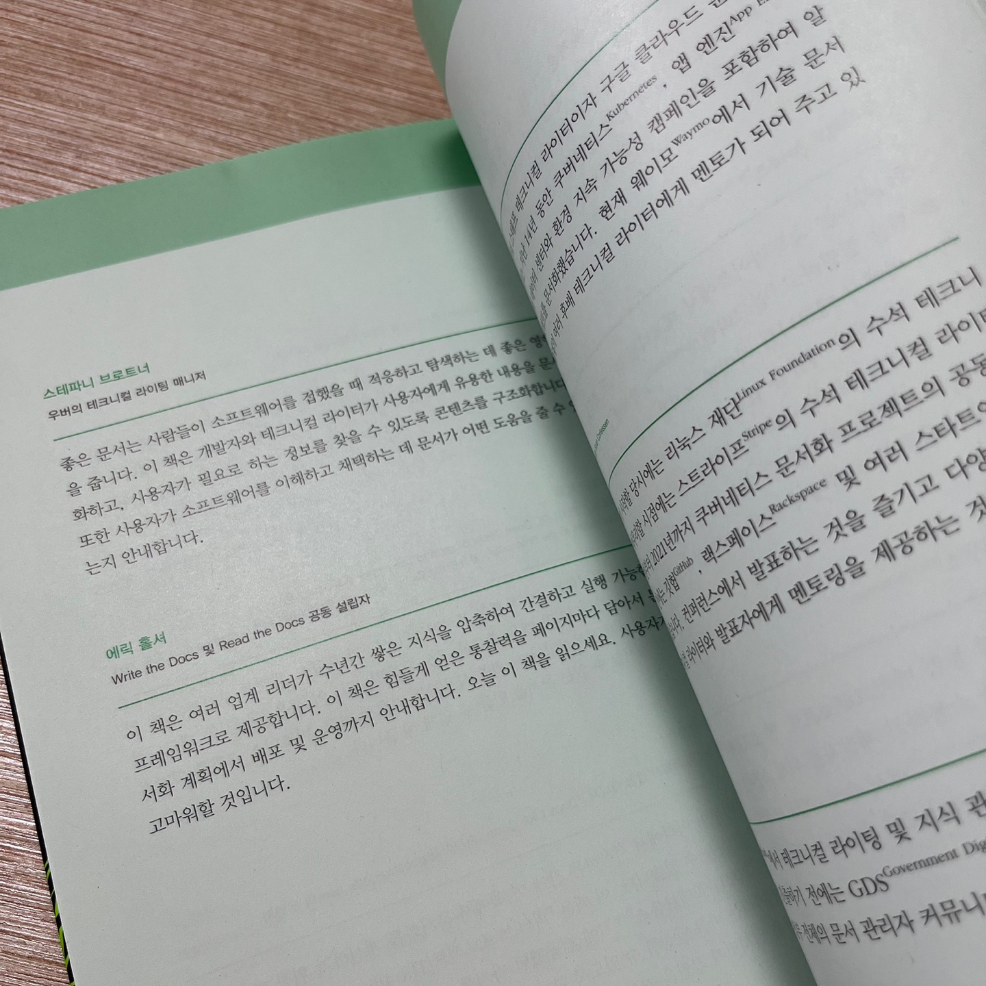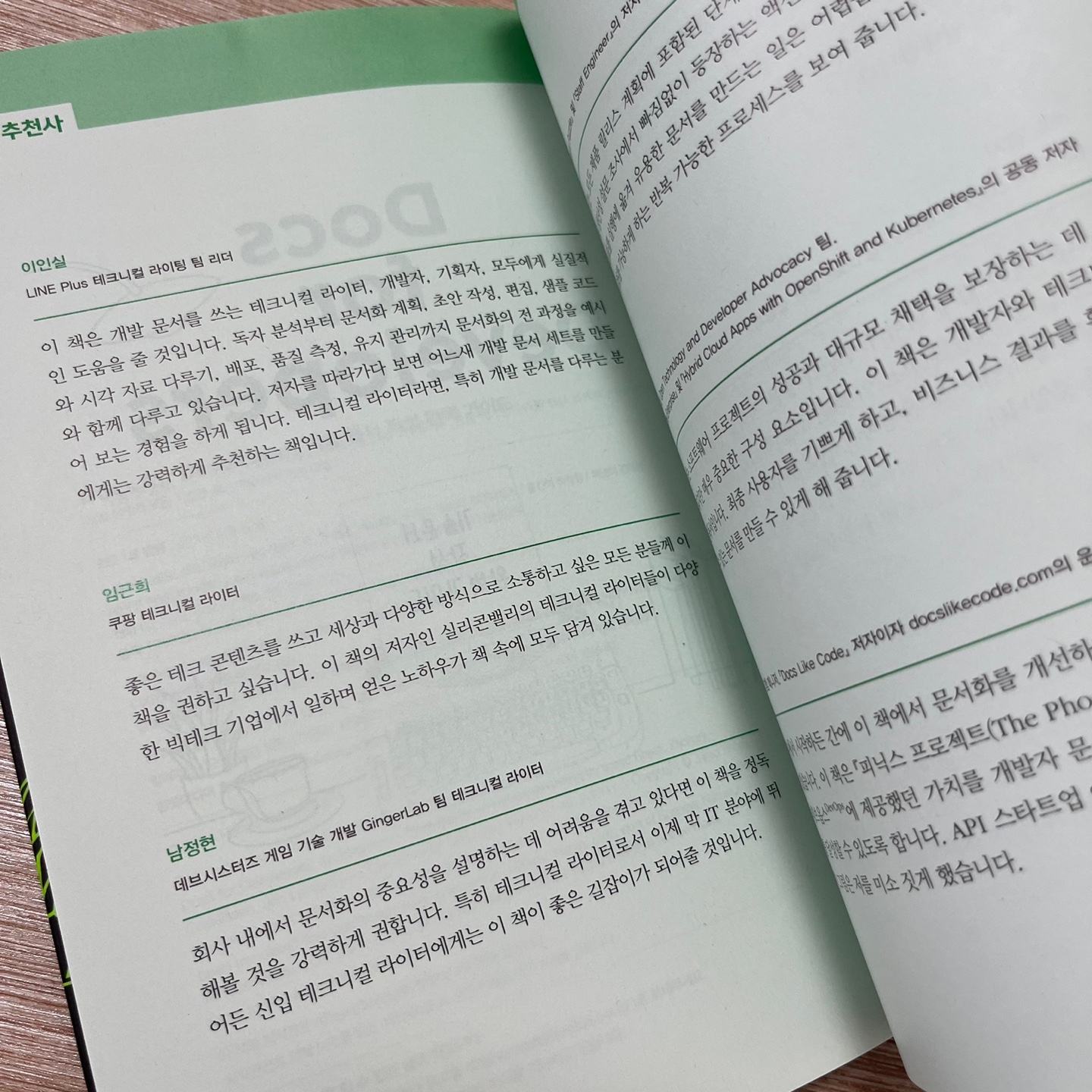 책의 추천사에도 여러 유명한 회사들의 테크니컬 라이터들이 글을 남겨놓았다. 당연하지만, 매우 권한다는 것이 주를 이루었다.