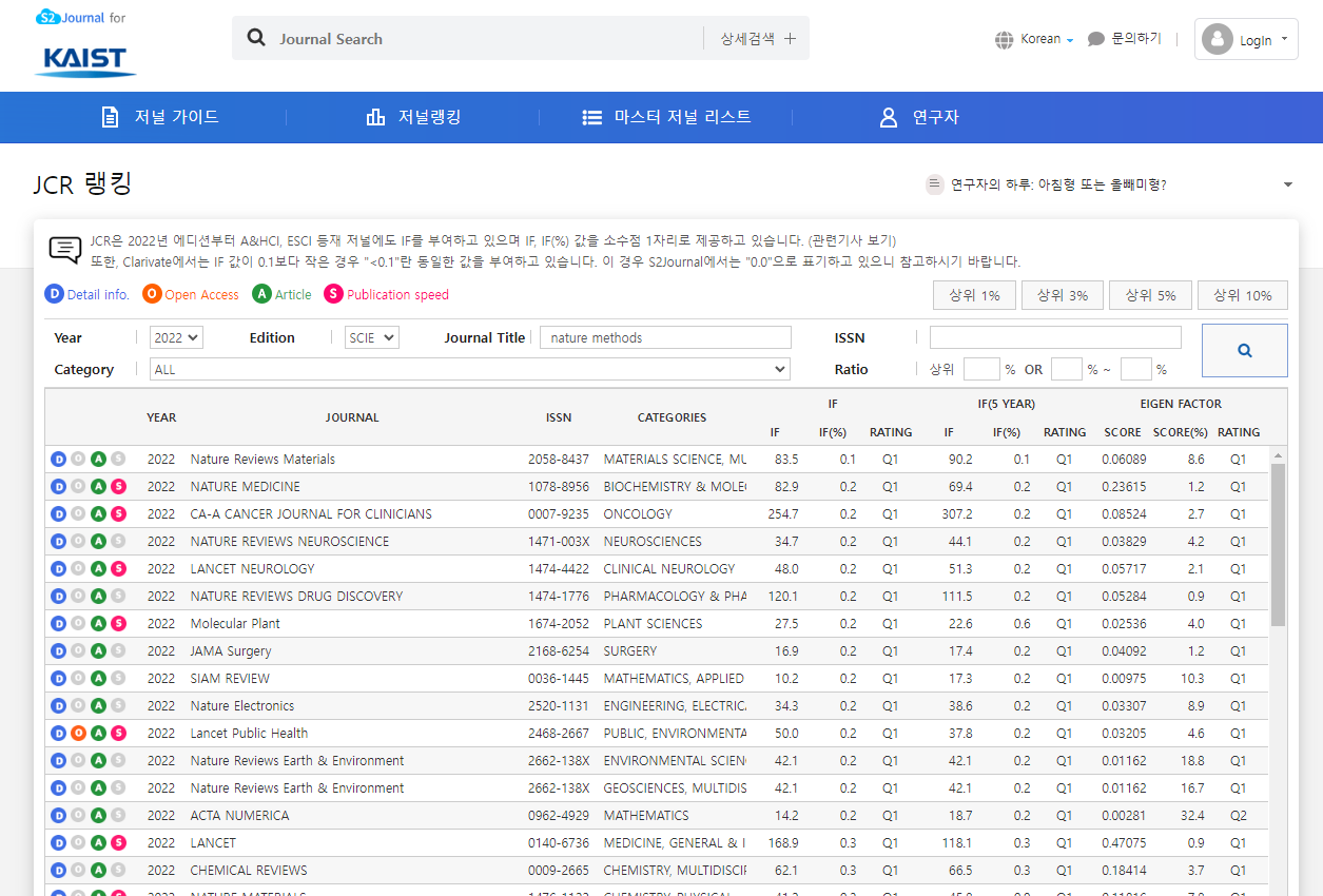 참고로, 또 학교 IP로만 들어갈 수 있긴 한데, 저널을 검색하는 개꿀 웹사이트를 하나 알려주자면 https://s2journal.bwise.kr/jcr/jcrCategoryRankingPage.do 이 s2journal 이라는 것이 진또배기이다.
