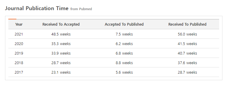 이런 Journal publication time 섹션을 보면 논문을 내서 얼마나 리뷰가 걸리는지도 대략 알 수 있고 억셉되고 퍼블리쉬가 언제 되는지도 알 수 있어서 논문을 내고 생기는 공허함과 불안함을 달래는 데에 도움이 된다.