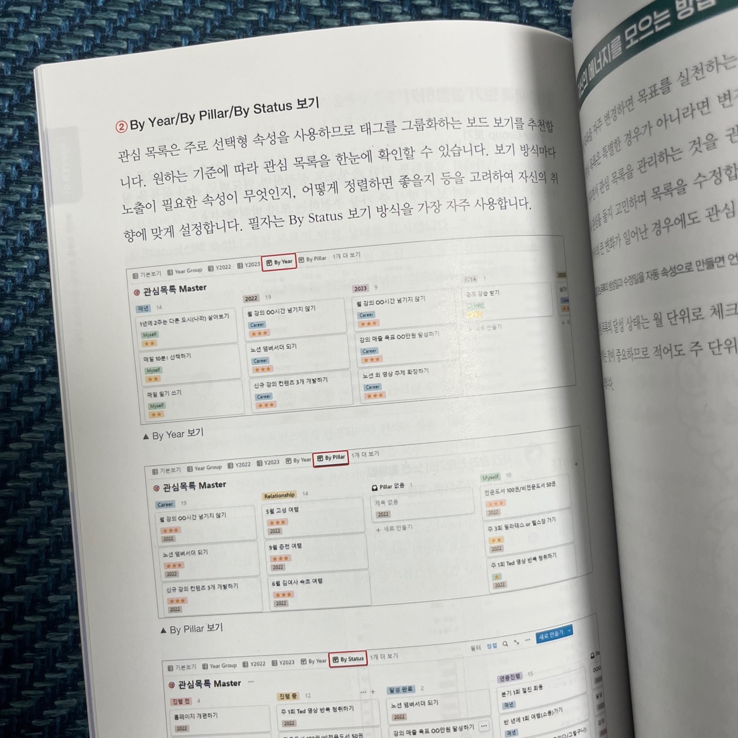 이 책에는 최근 많이 사용되고 있는 노션에 대해서 거의 모든 기능이 다 설명이 되어 있는 것 같다. 또한, 단순히 노션이라는 프로그램을 설명하는 것에서 그치는 것이 아니라, 시간이나 업무를 어떻게 효율적으로 관리하는지에 대한 노하우도 함께 들어있다. 가격도 그리 비싸지는 않으니 하나 사서 편하게 읽어보면 좋을 것 같다.