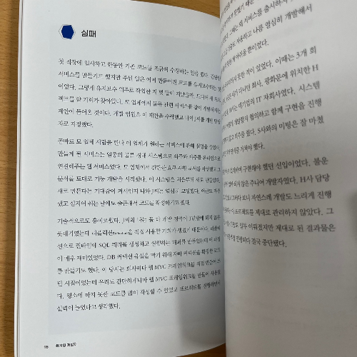 우선 책을 쓰신 분이 어떤 인생을 겪어왔고 또 이 책을 쓰게 되었는지에 대해 나온다. 개발자의 회사 생활에 대한 얘기는 뭔가 매번 재미있는 것 같다.