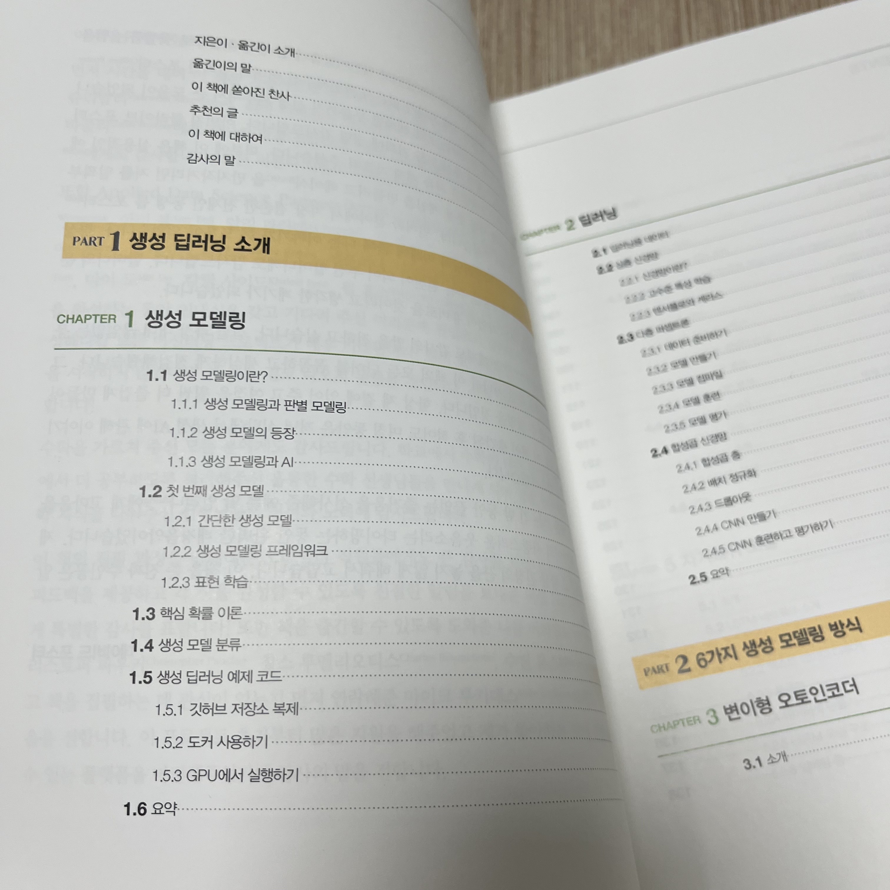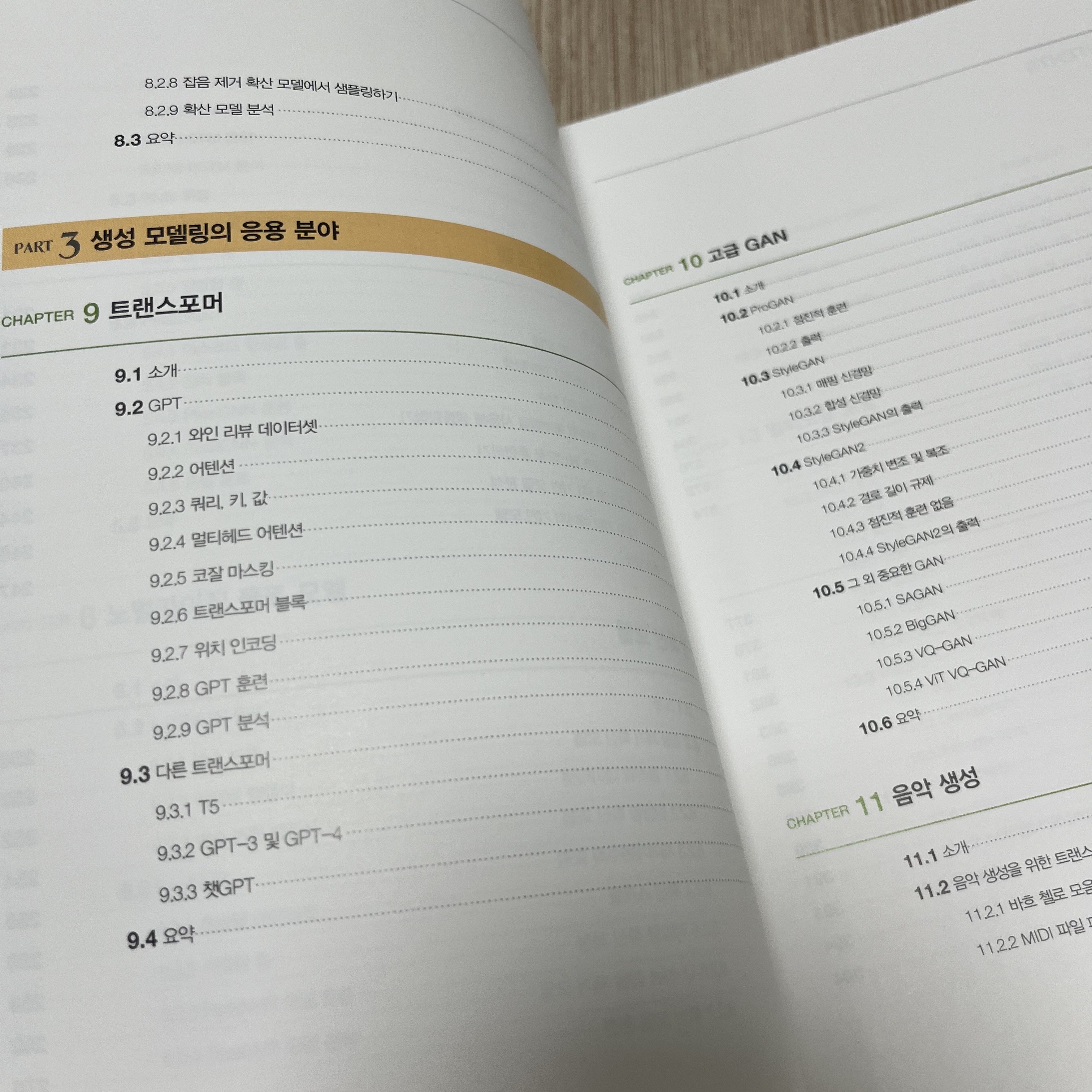 생성 모델이 무엇인지부터 시작해서 Energy based model, Diffusion model, Transformer 등 다양하게 다룬다. 사실 "고급 GAN"이라고 불리는 챕터의 StyleGAN이나 VQ-GAN 등은 조금 오래된 것 같기도 하고, "음악 생성" 챕터도 뭐 그냥 알려주고 싶어서 넣어놓은 것 같긴 한데, 전반적으로 저 카테고리 순서가 이상한 것 같긴 하다.