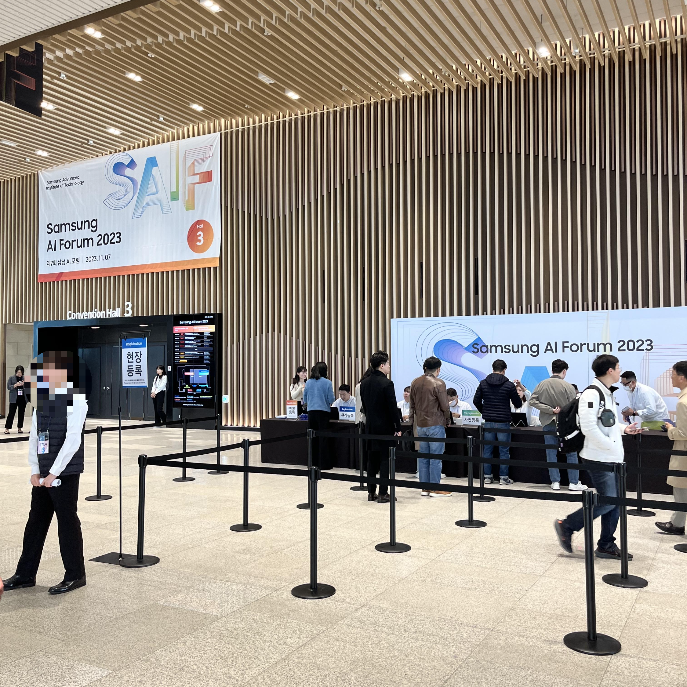 삼성종합기술원에서 진행하는 삼성 AI 포럼 2023에 참석했다. 작년에는 코엑스 인터컨티넨탈에서 진행했는데, 이번에는 수원 광교에 있는 수원 컨벤션 센터에서 진행했다. 작년에 한 번 왔어서 어느 정도 익숙하기도 하고 큰 새로움은 적었다. 아무래도 코엑스 때와 비교해서는 규모가 조금 작아지긴 한 것 같고, 취업 상담 부스의 경우 차이가 조금 크게 느껴졌다.