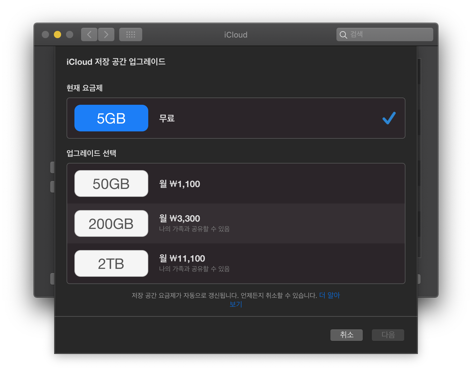그러나 아이클라우드의 경우 기본 제공되는 데이터의 양이 5GB이고, 용량을 업그레이드하면 아래와 같은 금액이 필요합니다. 그러나 아이폰, 맥북프로, 데스크탑 등에서 사용하거나 조금이라도 용량을 많이 사용하신다면 200GB는 부족할 수 있습니다. 저의 경우에도 동영상 편집, 어플리케이션 개발 등으로 용량을 많이 차지하는 파일들이 있을 뿐 아니라 사진이나 영상, pdf 등으로도 상당히 용량을 사용하기 때문에 200GB는 부족하였습니다. 그러나 애플 특유의 용량 장사(제일 적절한 용량의 선택지를 만들지 않습니다,,)로 인해 2TB를 구매하기에는 월 11000이 아까웠습니다.
