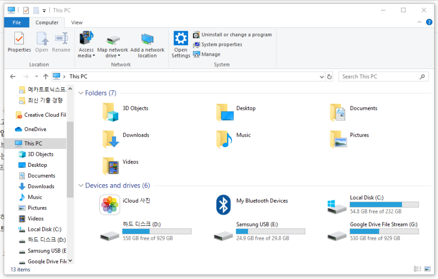 아래 사진을 보시면, 맥북과 데스크탑 모두 Google Drive File Stream이라는 새로운 위치가 생긴 것을 볼 수 있습니다. 맥북에서는 왼쪽에서 '위치'라는 항목 아래에 'Google Drive'라는 폴더가 생기고, 윈도우의 경우 아예 새로운 드라이브 처럼 '내 PC' 아래에 생성되는 것을 볼 수 있습니다. (아래 오른쪽 그림에서 맨 오른쪽 아래에 Google Drive File Stream(G:)라고 표시되어 있습니다.)