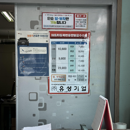 평일 낮이라 손님도 별로 없었어서 번호판 제작도 한 10분? 그냥 서류 작성, 제작, 교체까지 30분도 안되게 한 것 같다. 참고로 차량 등록 사업소에는 사람이 엄청 많았다...