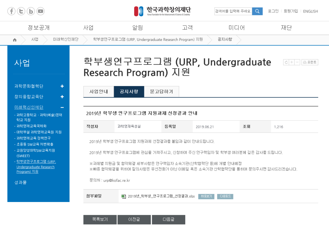 2019년 학부생 연구프로그램 지원과제 선정결과를 붙임과 같이 안내드립니다. 2019년 학부생 연구프로그램에 관심을 가져주시고, 신청하여 주신 연구책임자 및 학부생 여러분께 깊은 감사를 드립니다. ※과제별 지원금 및 협약체결 세부사항은 연구책임자 소속기관(산학협력단 등)에 개별 안내예정 ※빠른 협약체결을 위하여 질의사항은 유선전화가 아닌 이메일 혹은 소속기관 산학협력단을 통하여 문의주시면 감사드리겠습니다. 문의처 : urp@kofac.re.kr