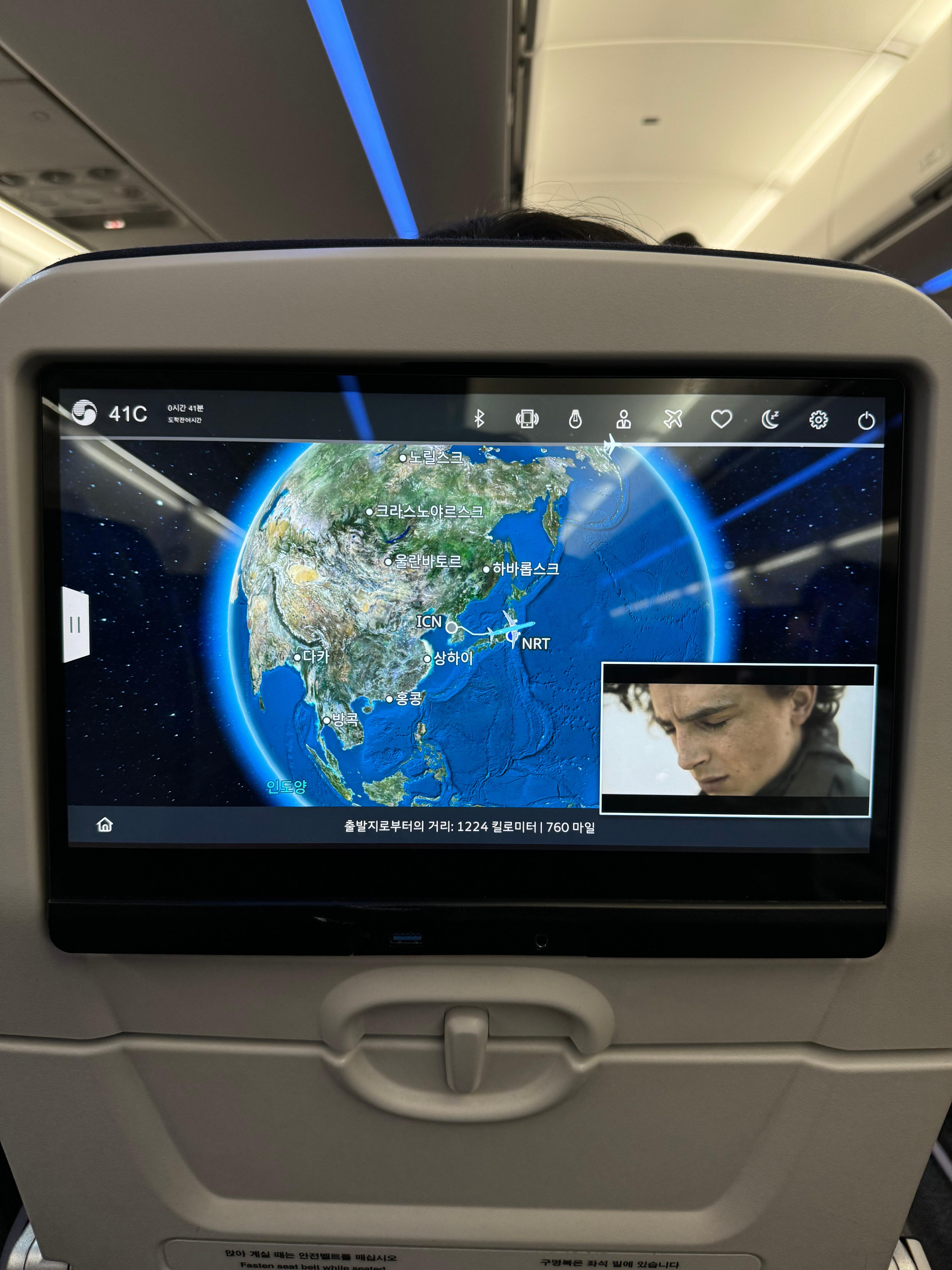 그래서 일본 나리타 공항을 대한항공을 타는 짓을 해봤고 무슨 이어폰도 주고 비행기가 완전 새것이었다. 승무원 분이 말해줬다 새거라고 ㅋㅋ 샌드위치 같은 간식도 아니고 진짜 기내식도 주었고, 무엇보다 모니터가 장난이 아니었다.