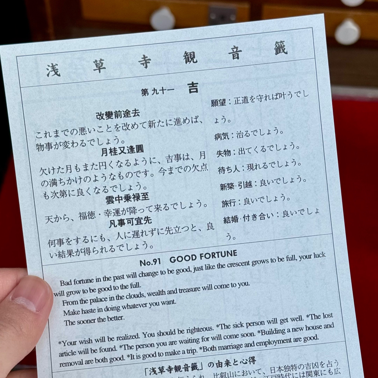 100엔짜리 동전을 구멍에 넣고 어떤 숫자를 하나 뽑아 안에 있는 종이를 읽는 것인데, 운 좋게 Good fortune이 떴다. 그래서 가져와서 연구실 책상에 걸어놨다. 여기도 그렇고 여행하며 본 여러 사찰들에서 기념품이라던지, 향을 피운다던지 모두 동전을 알아서 넣고 하나씩 가져가는 양심에 맡기는 시스템이었다.