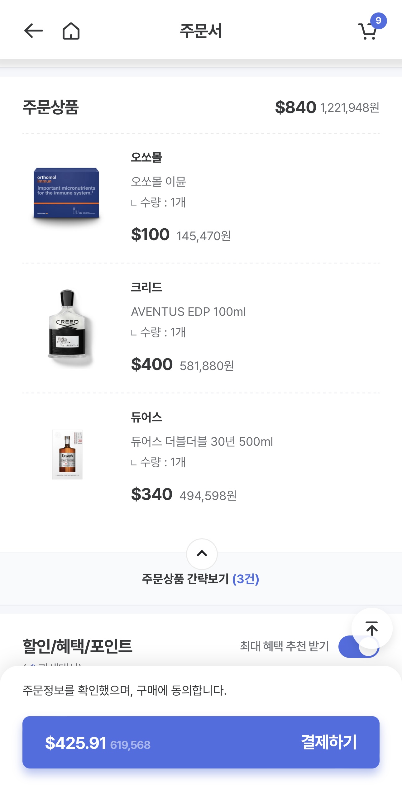 이제 사실 몇 개월 지나서 잘 기억은 안나는데, 두 병 다 해서 면세한도 400$ 이내로 거의 딱 맞춰서 산 것 같다.