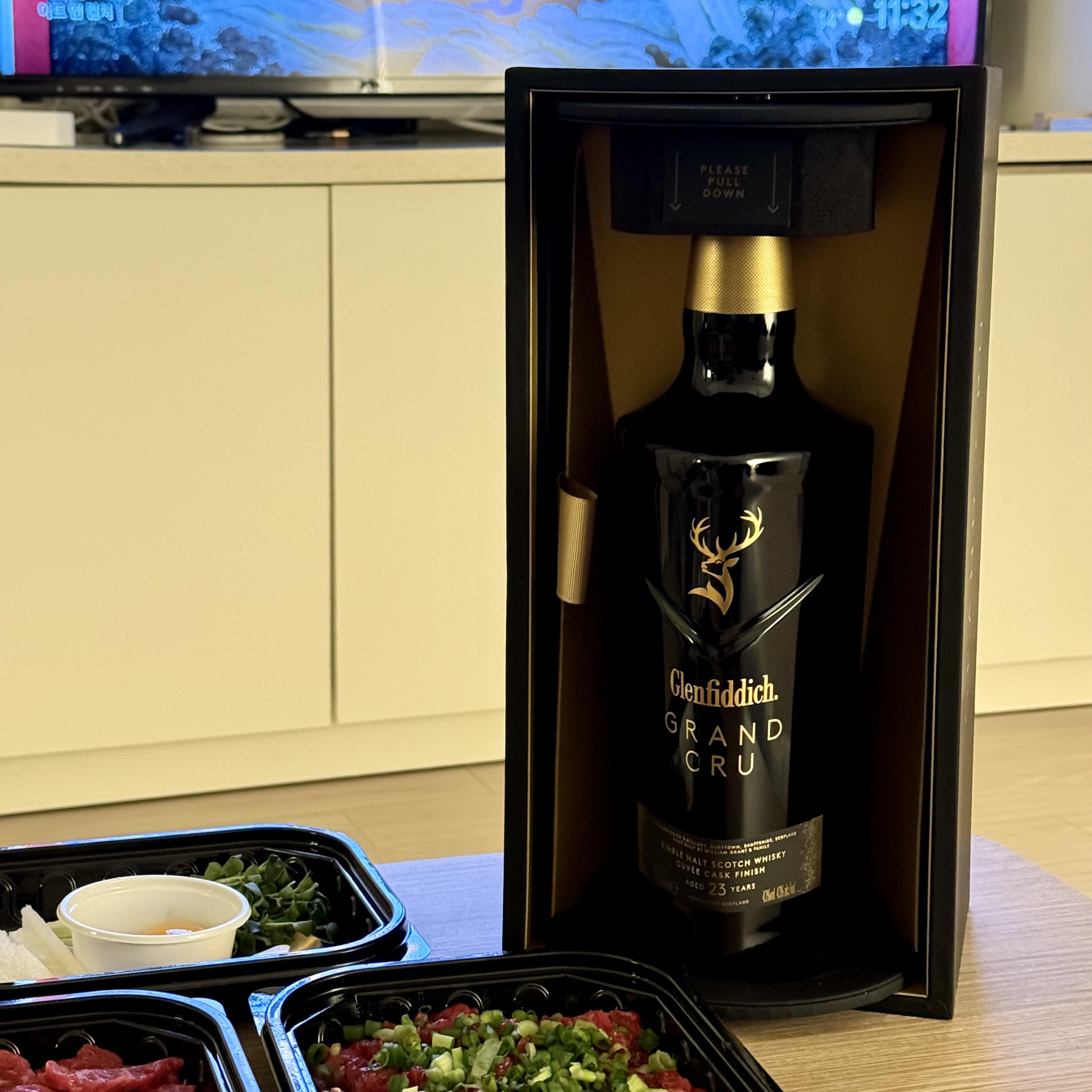그랑 크루 23의 경우 그냥 흔한 글렌피딕 느낌이 조금 났다. 얘의 장점은 포장이나 여는 방법이 예뻐서 관상용이나 손님 왔을 때 보여주기 좋다? 인 것 같다. 다음과 같이 앞 뚜껑을 돌리면 안에 숨겨져 있던 위스키 병이 보이는 형태이다. 이 술은 도수가 46%였던 것 같은데, 면세 전용이 일반 버전보다 더 도수가 높다고 한 것 같다. 면세로 사면 매우 저렴하고, 구하는 것이 그리 어렵진 않아서 면세로 사길 추천한다.