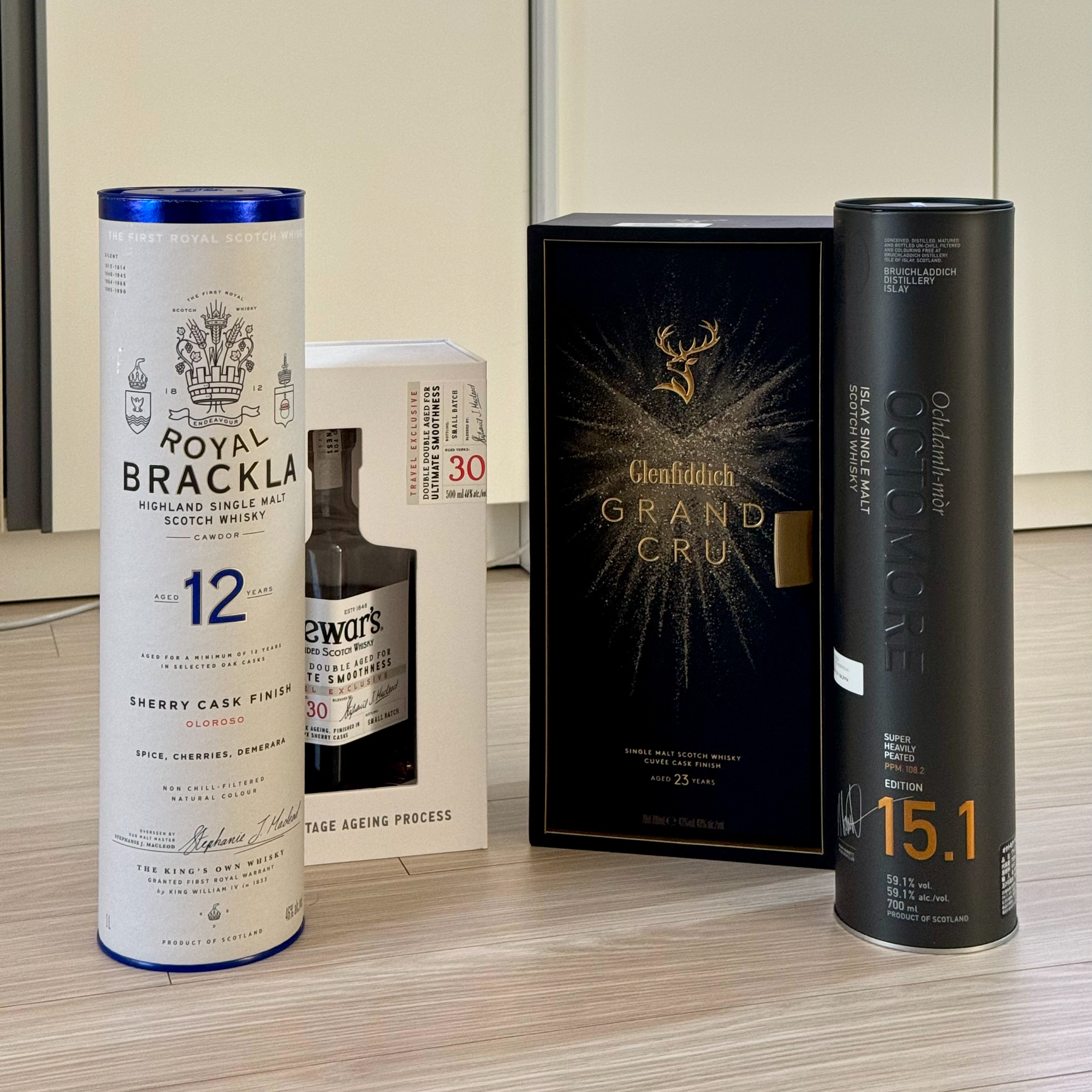 최근 친구들이 집에 와서 이제 이 두 술을 까봤는데, 한 줄로 요약하면 글렌피딕 그랑 크루 23은 너무 무난해서 기대 이하고, 듀어스 30년은 밸런스도 좋고 매우 부드러워 좋았다. 사진에 있는 옥토모어 15.1은 친구가 가져온 것인데, 기존 14.1을 맛있게 먹엇던 나와 친구 모두 매우 호평이었다. 옥토모어도 확실히 하나는 있어야 될 것 같다.
