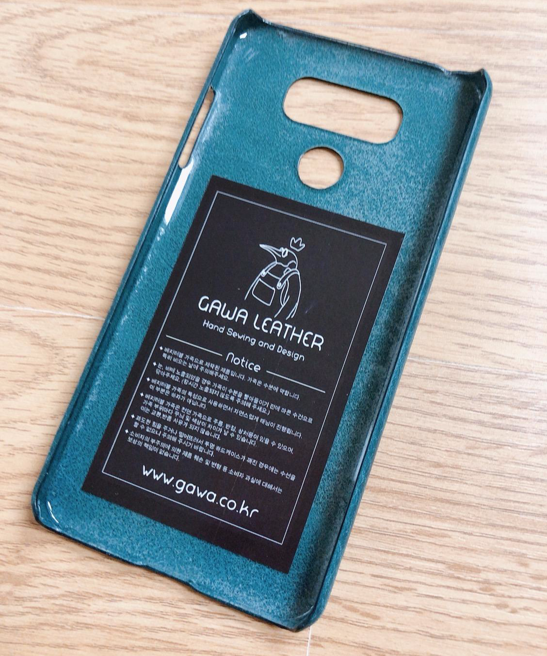 저 스티커에는 가와 레더(Gawa leather) 로고와 홈페이지, 가죽 케이스를 사용할 때의 주의사항이 적혀 있습니다.