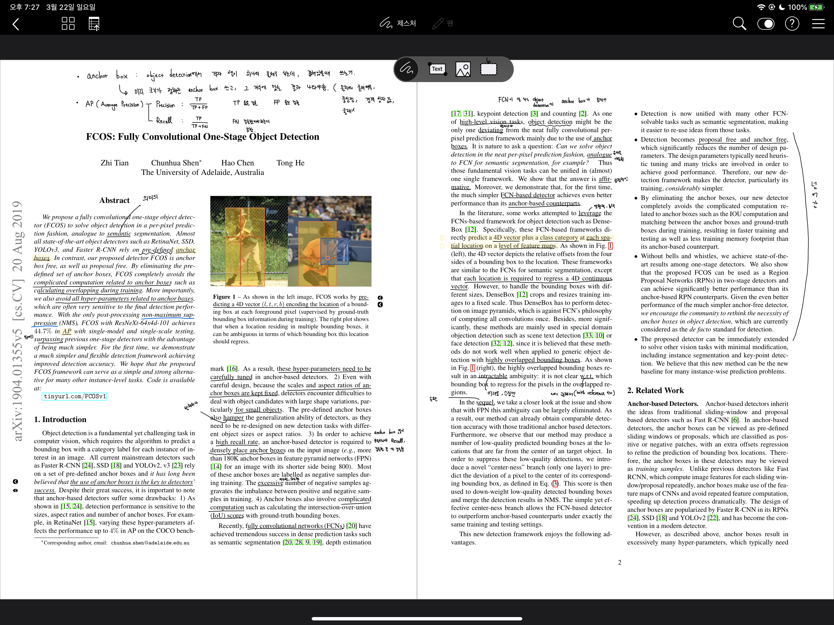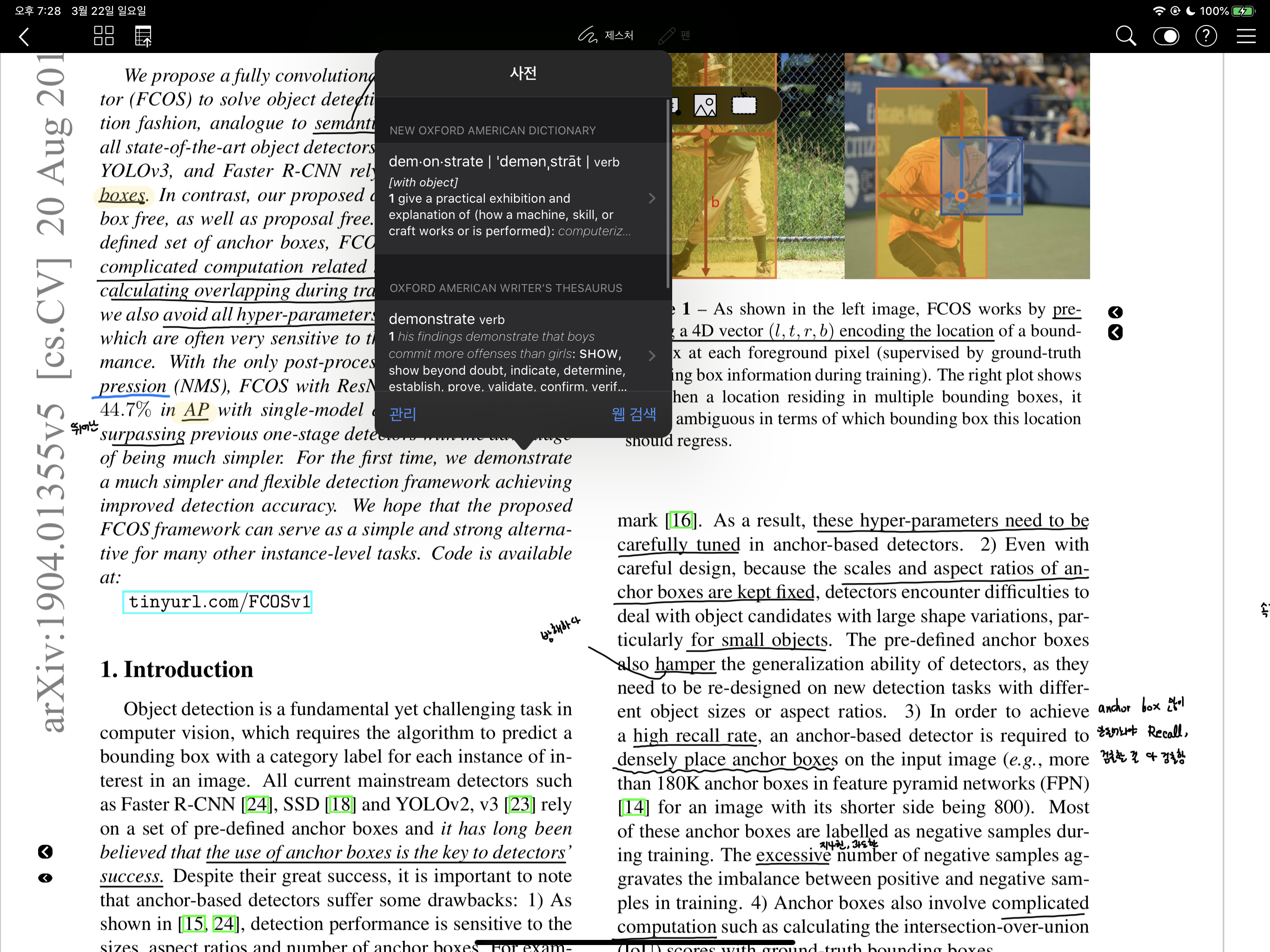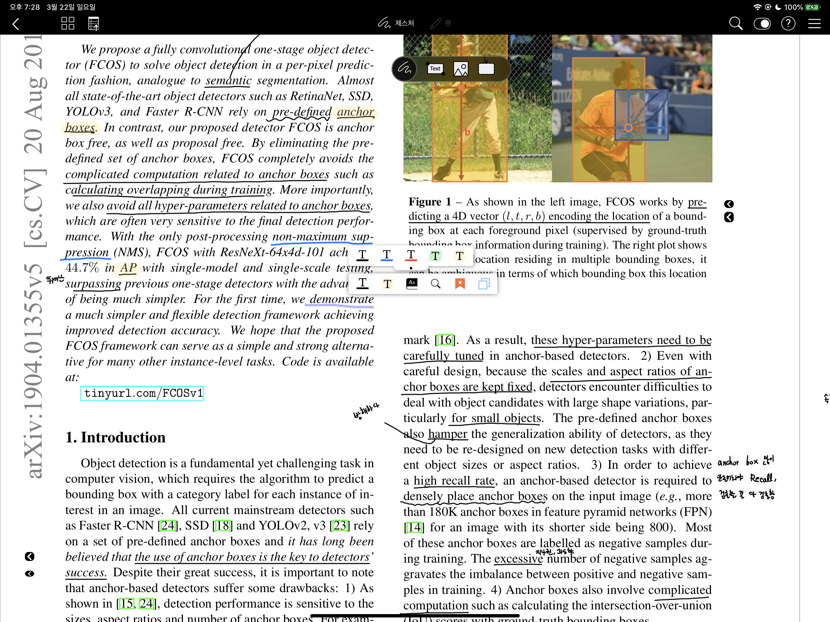 논문을 볼 때는 위 화면처럼 나옵니다. 보시면 굉장히 뭐가 많죠. 제가 필기한 것도 있지만 여기서 초록색, 빨간색 사각형이 중요합니다. 논문에 참고문헌이나 Fig 번호에 사각형이 자동으로 생기는데, 이를 누르면 그 위치로 이동해서 굉장히 편합니다. 그리고 머신 러닝 논문의 경우 위에서처럼 사이트 주소를 걸어놓는 경우가 있는데 플렉슬이 사이트도 자동으로 하늘색 사각형을 쳐주는 것을 볼 수 있습니다. 이를 누르면 사파리로 창이 뜨고 아이패드기 때문에 오른쪽에 띄워놓고 같이 보면 또 좋습니다.