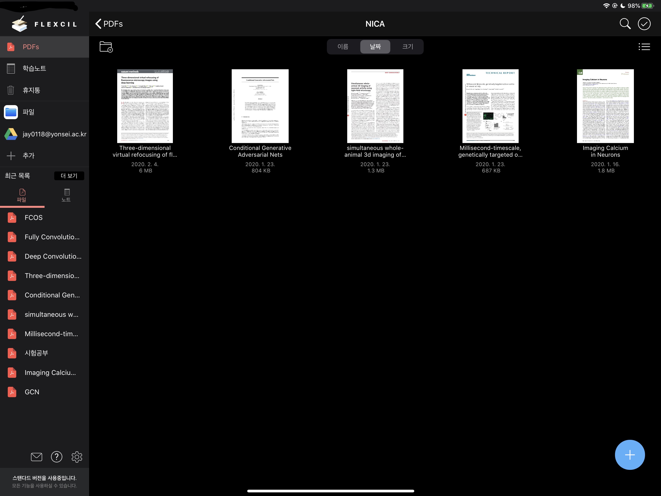앱은 이렇게 생겼습니다. 직관적이고 심플하게 생겼죠. Flexcil도 Notability와 마찬가지로 사파리나 다른 앱에서 pdf가 띄워져 있으면 공유 버튼을 눌러서 플렉슬로 불러올 수 있습니다. 메인화면은 단순하지만 노터빌리티와 다르게 앞 표지가 그리드 형식으로 띄워져 있습니다. 개인적으로 노터빌리티보다 플렉슬의 메인화면이 논문을 보고 정리하는 데에 있어서 좋은 것 같습니다. 약간 모으는 느낌도 납니다. e-book 앱의 책장을 보는 느낌이죠.