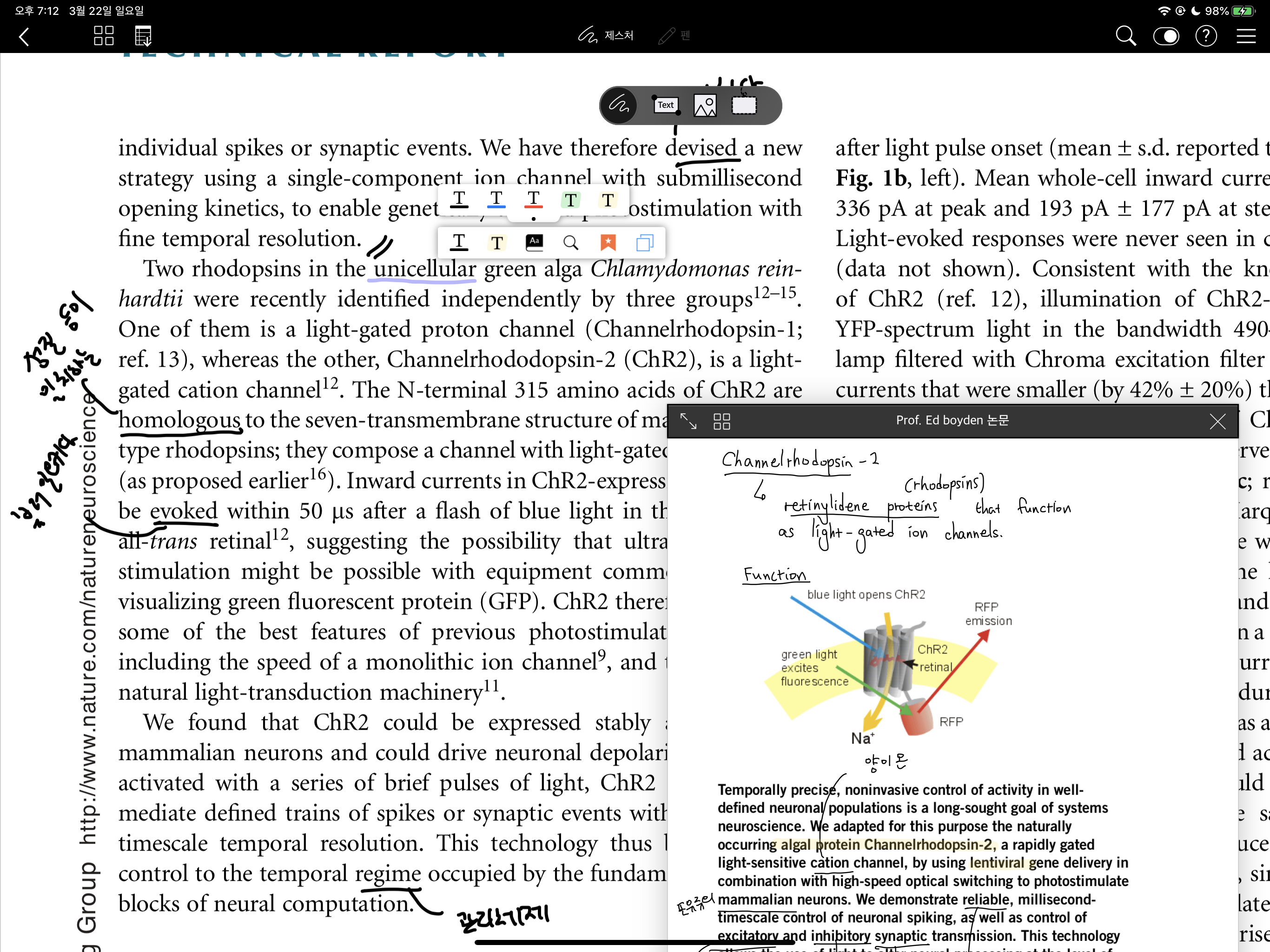 대학원에 와 논문들을 읽고 공부해야 하는데 노터빌리티로 했을 경우 약간 부족함이 있었습니다. 논문은 대부분 pdf로 되어있는데 노터빌리티의 경우 피피티나 피디에프 모두 노터빌리티로 가져오면 그림처럼 가져옵니다. 무슨 말이냐면 글씨와 삽화 이런 것을 구분 안하고 그냥 피피티나 피디에프를 필기의 배경처럼 만듭니다. 그래서 노터빌리티에서도 단어를 타이핑하고 영어사전을 킬 수 있지만, 피디에프에 적혀진 영어를 바로 찾을 수 없죠.