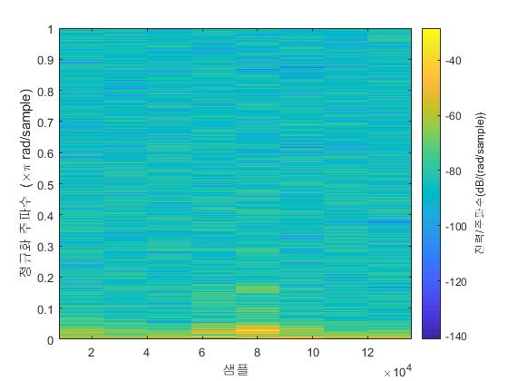 위 그래프를 참고하자면, 가로축이 0부터 3초이니 약 1.5초 쯤부터 정규화 주파수가 0.03정도인 부분의 크기가 -30dB/(rad/sample) 정도로 큰 값을 보여준다는 정보를 얻을 수 있습니다.