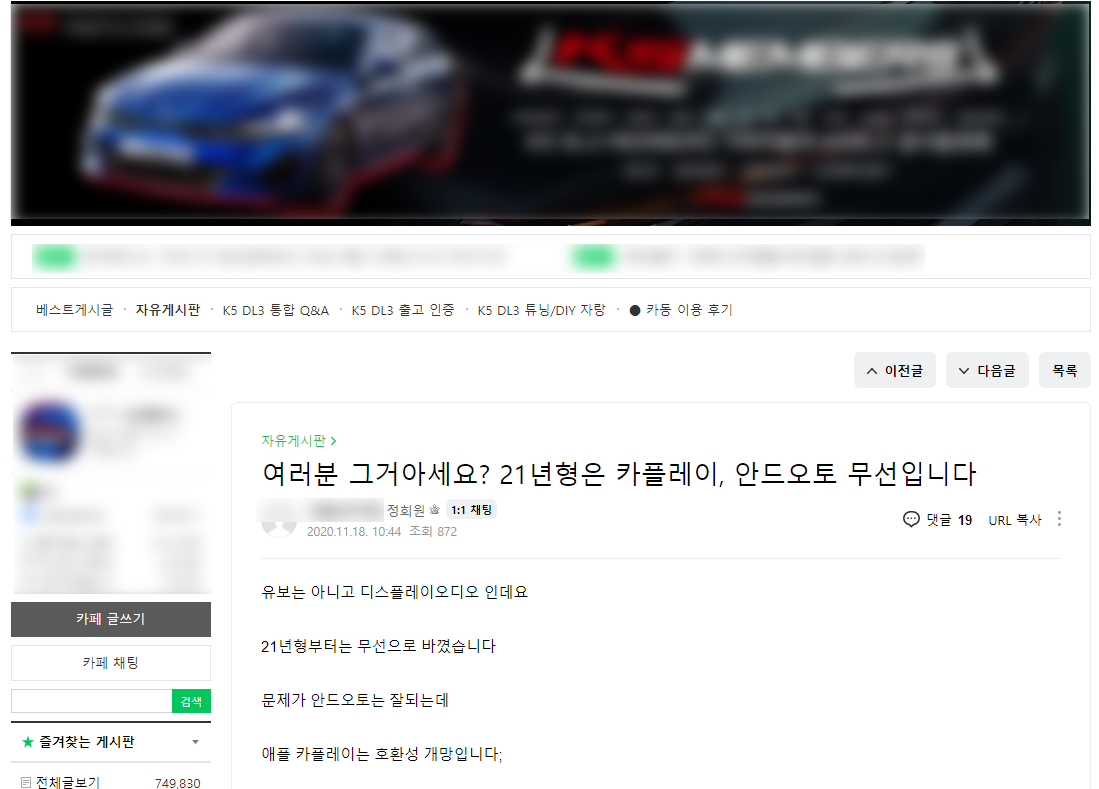 저 이외에도 K5 네이버 카페에서 다른 사람들의 얘기를 들어보았는데, 유보 네비 없이 21년형인 경우에는 유선 연결이 안되고 무선만 된다고 합니다. 그리고 애플 카플레이의 경우 호환성 문제인지 연결이 굉장히 잘 끊긴다는 불편함이 저 말고 다른 사람도 겪고 있었습니다.