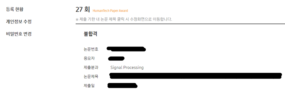 대학교를 다니는 동안 선배가 휴먼테크에 낸다는 말도 들었고 수상도 하셨었는데, 이번 27회차에 저도 한 번 초록을 제출해보았습니다. 본래 하던 연구가 아니라 최근에 아이디어를 가지고 시작한 연구인데 잘 되어가고 있어 페이퍼로 내려고 합니다. 그와 함께 휴먼테크에도 제출해보았죠. 휴먼테크 논문대상은 저작권을 가져가지 않고 제출한 논문이 사회로 공개되지 않기 때문에 많은 분들이 직접 저널이나 학회에 내기 이전에 휴먼테크에 제출해보시더라고요. 그리고 휴먼테크의 조건 중 하나가 아직 사회로 공개되지 않은 논문만 심사하기 때문에 이미 저널 학회에 제출해서 공개가 됐다면 휴먼테크에 제출할 수 없습니다. 저와 교수님은 이제 크게 2가지 이유로 휴먼테크에 제출하고자 하였는데요, 첫 번째로는 말했다시피 저널 학회에 내기 이전에 한 번 제출해보자 라는 마인드였고 두 번째로는 휴먼테크의 Due date를 따라가면서 텐션 있게 논문을 준비해보자였습니다. 논문의 퀄리티가 당연히 중요하지만 빨리 논문을 받아보고 싶은게 대학원생의 마음 아닐까요. 물론 퀄리티가 당연히 돼야하니까 기간 제한을 두고 빡세게 해보자 라는 마인드죠.