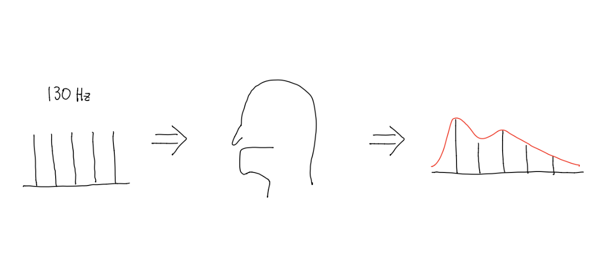 모음을 구분하기 위해 formant라는 개념을 사용합니다. 아래 그림과 같이 음성을 130 Hz의 impulse train이 있고, 혀를 포함한 구강 구조가 filter 역할을 하여 이를 통과시킨 결과물이 우리의 음성이라는 관점으로 볼 수 있습니다. 아, 에, 이, 오, 우 모두 음높이가 같다면 주파수가 같아 같은 impulse train으로부터 만들어지지만 그 발음을 각각 할 때의 입모양과 구강 구조가 다르기 때문에 각각 다른 필터를 통과하면서 발음이 생긴다는 것입니다.