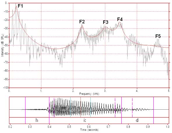 위 그래프에서 자잘자잘한 선이 FFT 결과, 붉은 선이 LPC로 근사한 결과입니다. pole의 개수가 제한되어 있기 때문에 자잘자잘한 디테일은 근사하지 못하고 전체적인 peak들을 우선으로 근사한 것을 보실 수 있습니다. 이렇게 근사를 하고 나면 formant가 딱 눈에 보입니다.