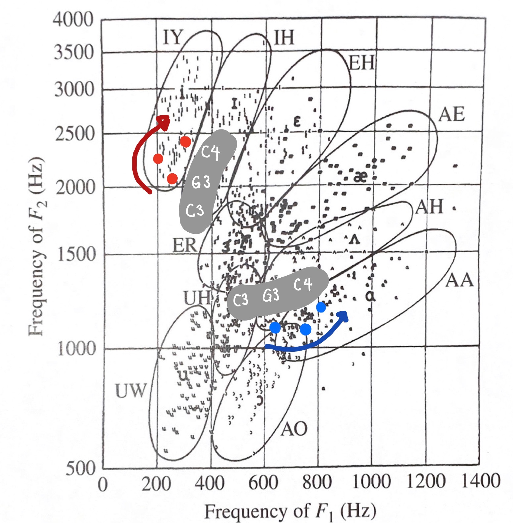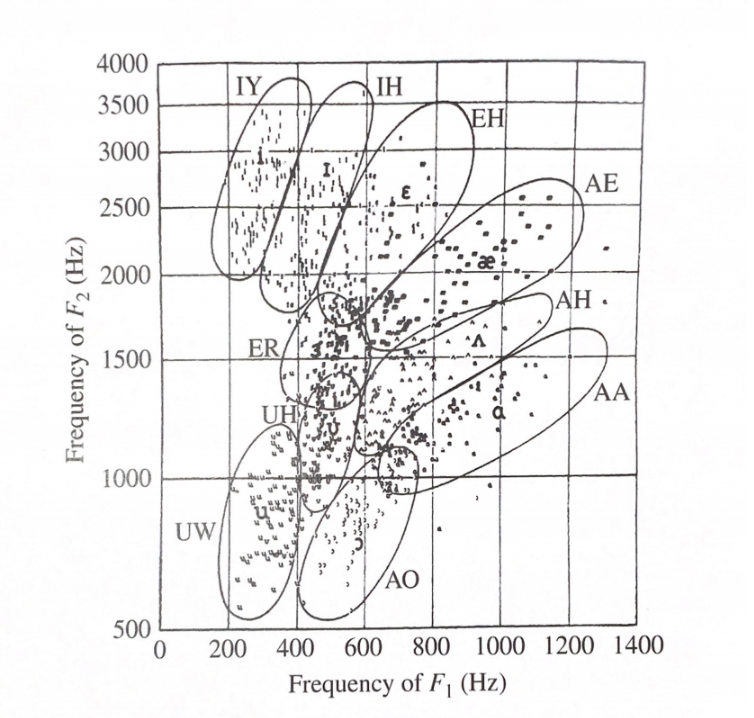 이를 앞서 나온 Formants에 따른 발음을 그린 그림에 표시하면 다음과 같습니다.