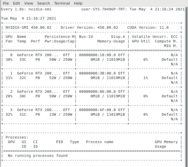 nvidia-smi 는 GPU의 사용량을 모니터링하기 위해 사용합니다. 여기에는 GPU가 몇 개인지 어떤 GPU인지, 메모리는 얼마나 사용하고 있는지, 파워나 온도 등 여러 정보가 나옵니다.