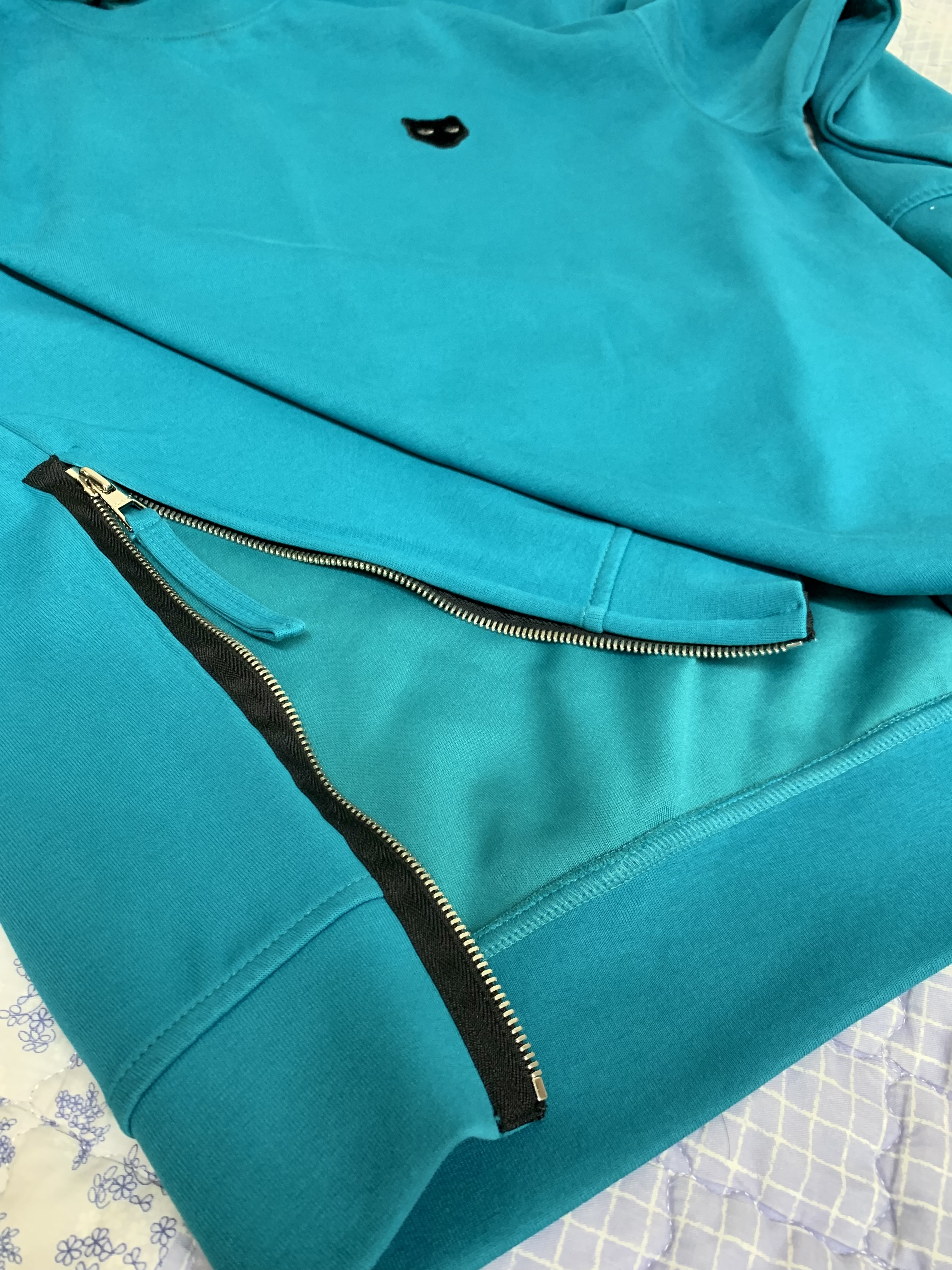 또 하나 포인트는 옷 오른쪽 아래에 지퍼가 있어서 닫을 수도 있고 열 수도 있다. 저 오른쪽 위에 사진이 그 지퍼인데, 색깔이 이상하게 나왔다. 옷 색깔은 왼쪽 사진이 맞다. 이 지퍼를 닫아도 되는데, 난 어느 정도 열어놓고 다닌다. 이걸 여는 게 그냥 여유로운 것도 맞는데, 안에 흰 티셔츠 같은 것을 입어가지고 또 포인트를 줄 수 있다.