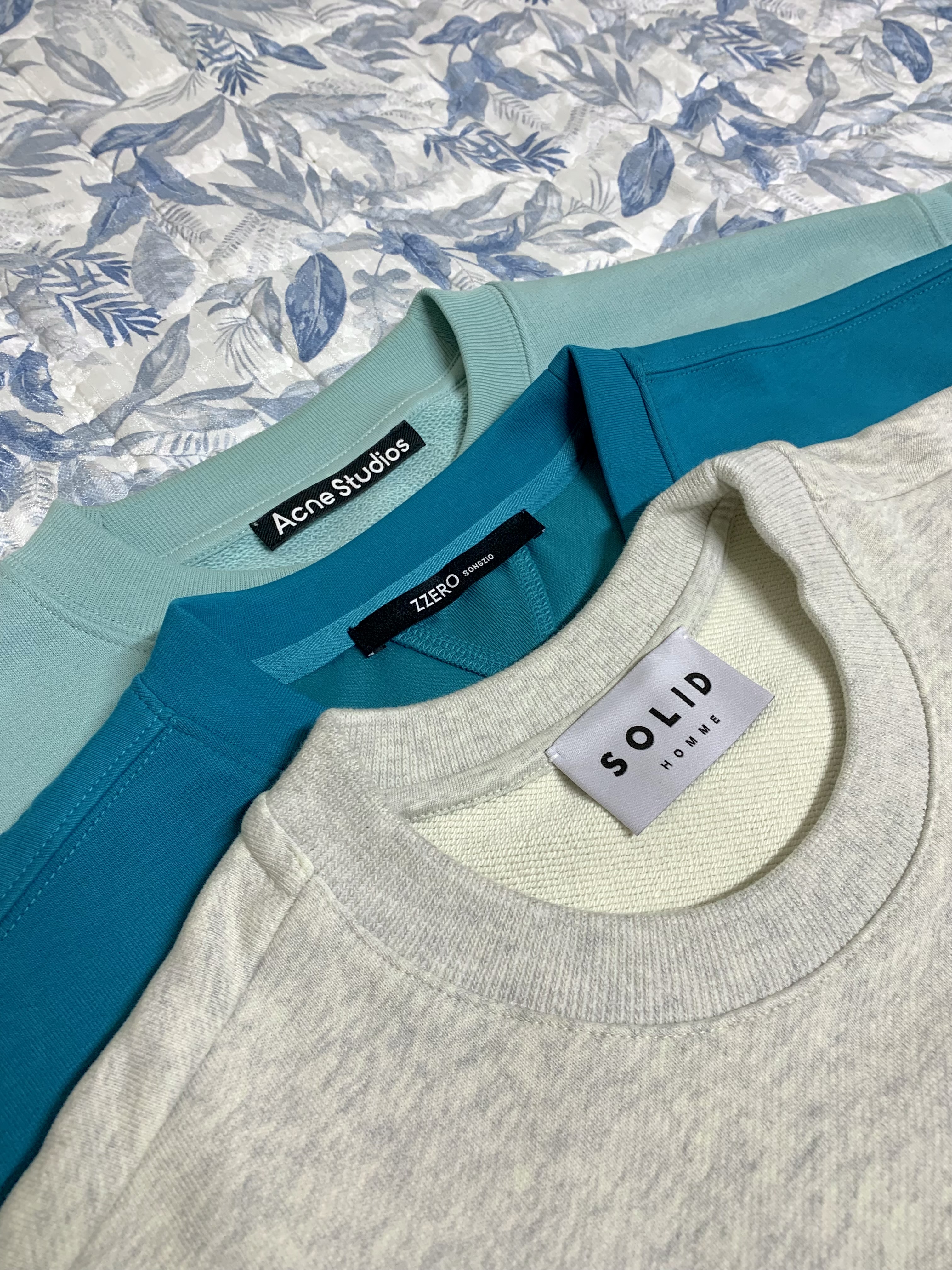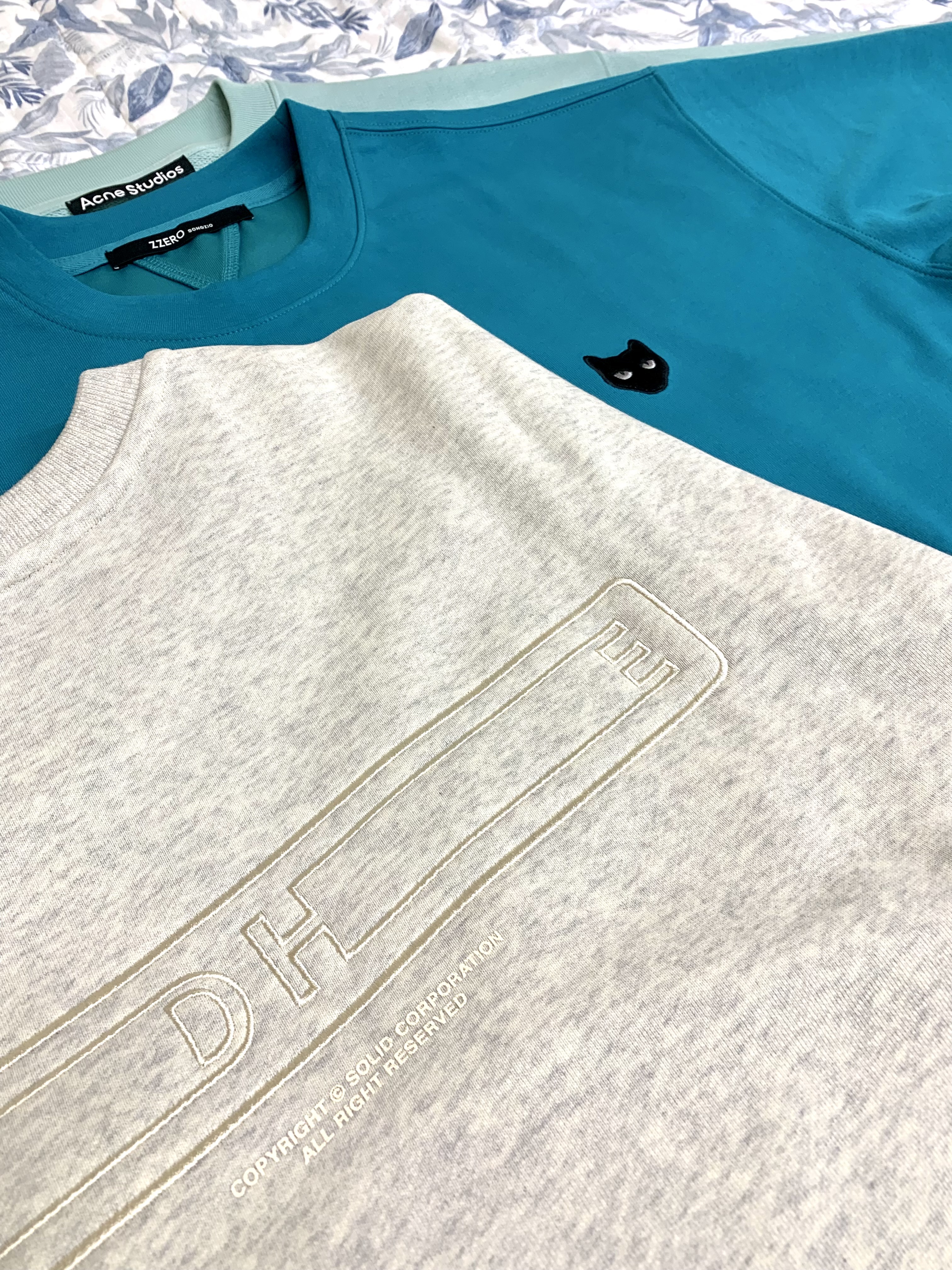 그리고 원래 아크네가 옷의 질이 좀 안 좋다 그러고 빨때마다 수축이 된다고 하는데, 또 막 옷의 질이 그렇게 안 좋거나 그렇지는 않다. 그냥 그런 정도? 인 것 같다. 물론 빨때마다 수축이 되는 건 맞아서, 작년에 산 저 자주색 맨투맨이 원래는 좀 오버핏이 심한데, 이제는 내 몸에 잘 맞게 되었다. 새로 산 민트색 맨투맨도 현재 오버핏임을 감안해도 나에게 크다고 느껴지는데 아마 몇 달 지나면 괜찮아질 것 같다. 저 아크네 스튜디오가 전혀 스트릿 브랜드가 아닌데도 옷이 진짜 크게 나온다.