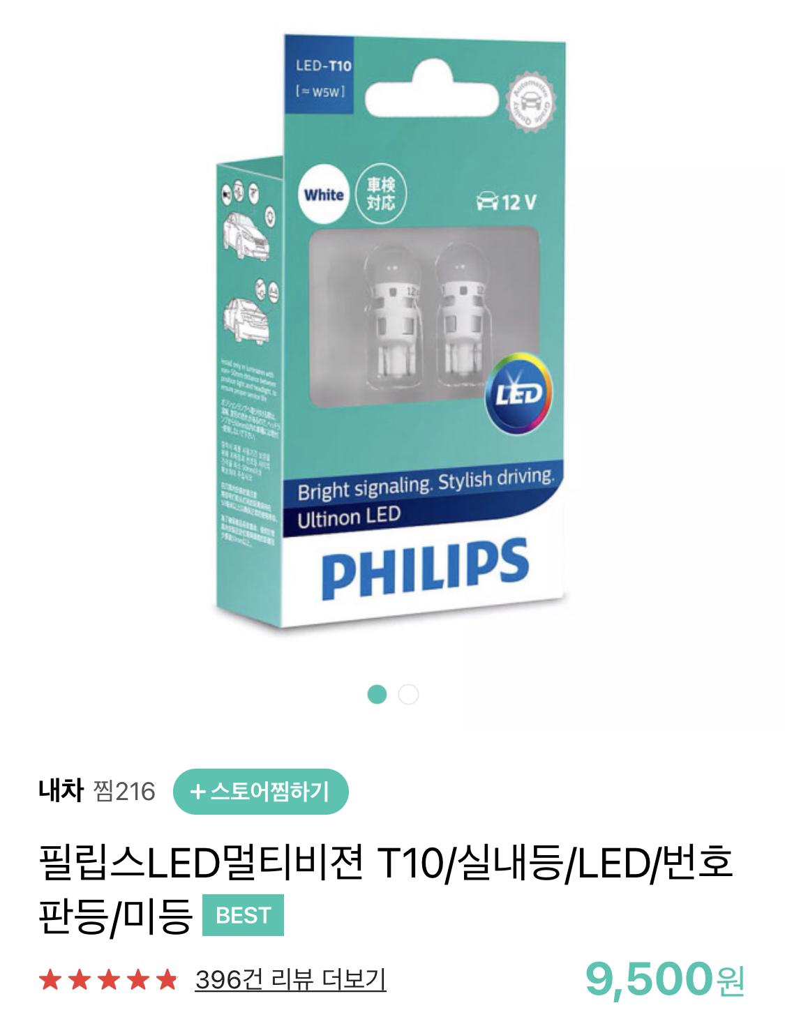 두 LED 제품이 주로 사용되는데, 반디 T10 사이드뷰 제품과 필립스 울티논 제품입니다. 조금 찾아본 결과 반디 제품이 절반 정도 저렴했는데, 필립스 제품이 비싼 만큼 평도 좋은 것 같아서 필립스 제품으로 구매했습니다. 해봐야 반디가 5천원, 필립스가 만원 정도라서 별로 고민을 안 했고 혹시나 몰라 2개입을 2개 샀습니다. 참고로 2개입이 1세트이고 번호판 등 한 번 교체하려면 전구 2개를 써야 합니다.