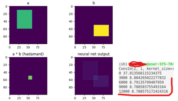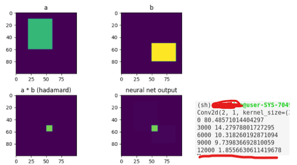 그림을 보면 a와 b가 있고, hadamard product (element-wise multiplication과 같은 말입니다.)인 target이 있고 뉴럴 네트워크 아웃풋이 있습니다. 보시면 타겟과 전혀 안 맞는 것을 알 수 있고, 학습 때 사용하는 로스 값을 찍어보아도 학습이 되지 않는 것을 볼 수 있습니다.