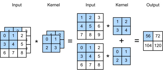 여기서 알아야 할 것은 convolutional layer의 한 kernel은 input으로 들어오는 데이터의 channel 정보들을 함께 보고 처리한다는 것입니다. 디테일하게는 input과 kernel의 각 채널별로 convolution (실제로는 cross-correlation)을 하고 각 채널별로 얻은 데이터를 또 더해줍니다. 여기서 보시면 2개의 input channel로부터 output이 만들어지는 과정은 kernel의 원소들과의 곱과 channel-wise 합이 있습니다.