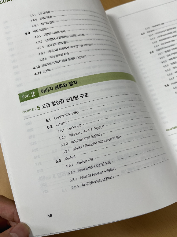 Part 2는 이미지 분류와 탐지로 Classification과 Detection을 다룬다. LeNet, VGGNet부터 ResNet등 모델이 점점 deep해지는 역사를 함께 따라간다. 이 파트는 인터넷에도 지식은 넘쳐흐르는데, 지식의 홍수 속에서 공부하기보다는 이렇게 책으로 정리된 것을 따라가는 것이 아마 처음 공부하기에는 훨씬 편할 것이다.