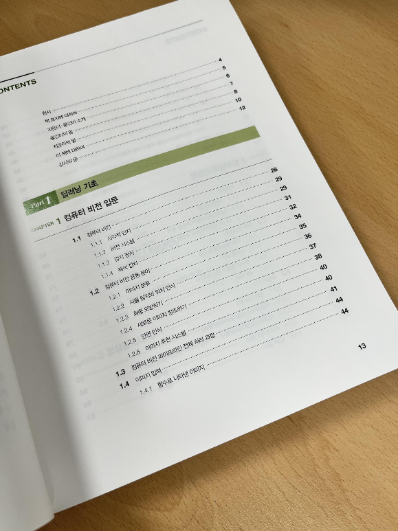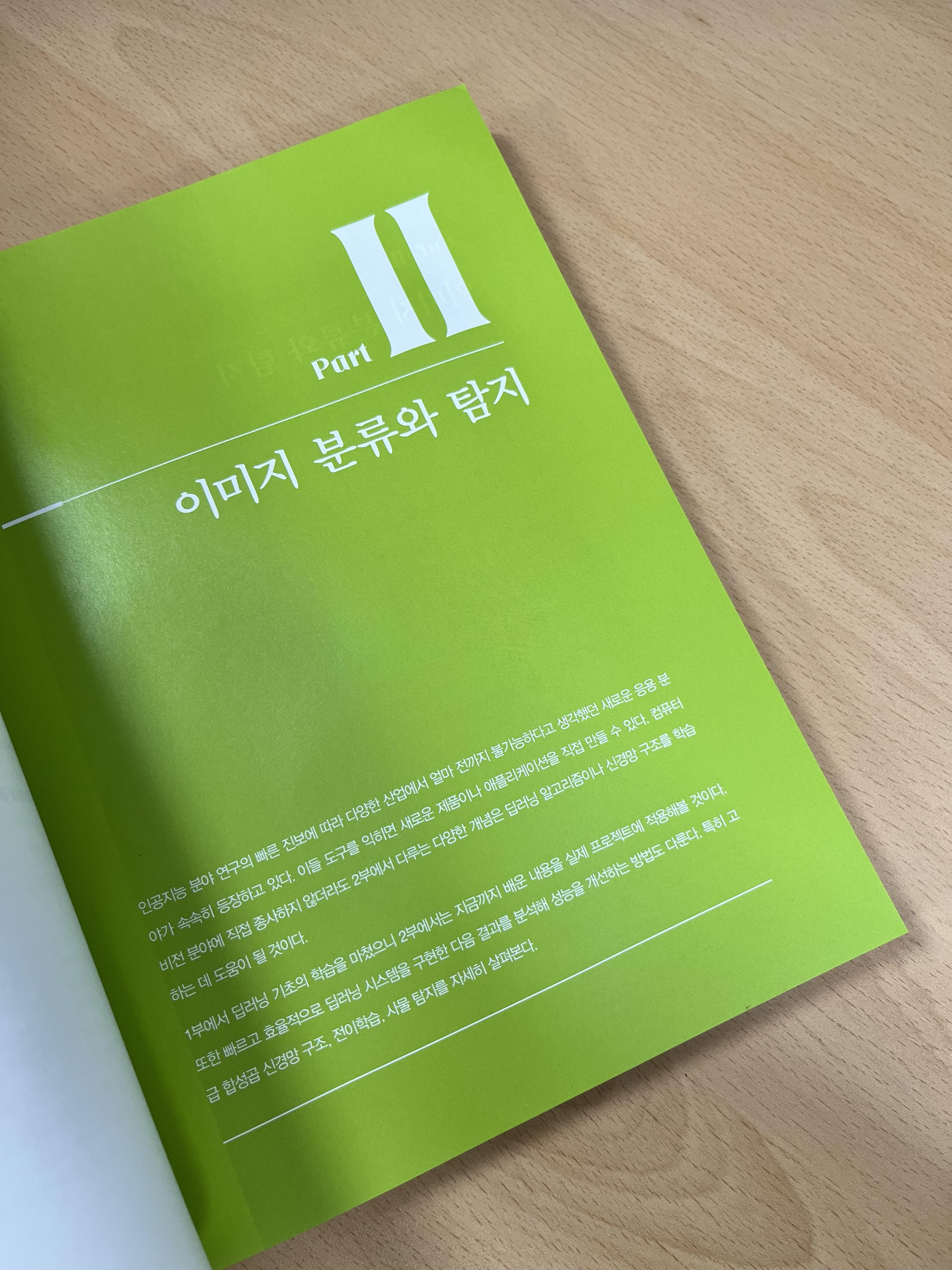위 책은 컴퓨터 비전을 위한 인공 지능을 처음 공부해보려고 하는 사람에게 추천할 만한 책이다. 그렇다고 마냥 기초적인 내용만 있는 것이 아니라 후반부에는 꽤 중요하고 어느 정도 수준이 있는 내용도 다루며 실습 자료나 코드 설명이 친절하여 이 책을 읽고 실습을 따라온다면 꽤 많은 지식을 얻을 수 있을 것 같다. 무엇보다 번역은 당연하고 용어들 또한 모두 한국어로 되어 있어 편하게 읽을 수 있다. (나는 이 분야에서 연구를 하고 있기 때문에 영어 단어가 편하여 이 글에 영어 단어가 나오고 있긴 하다.)