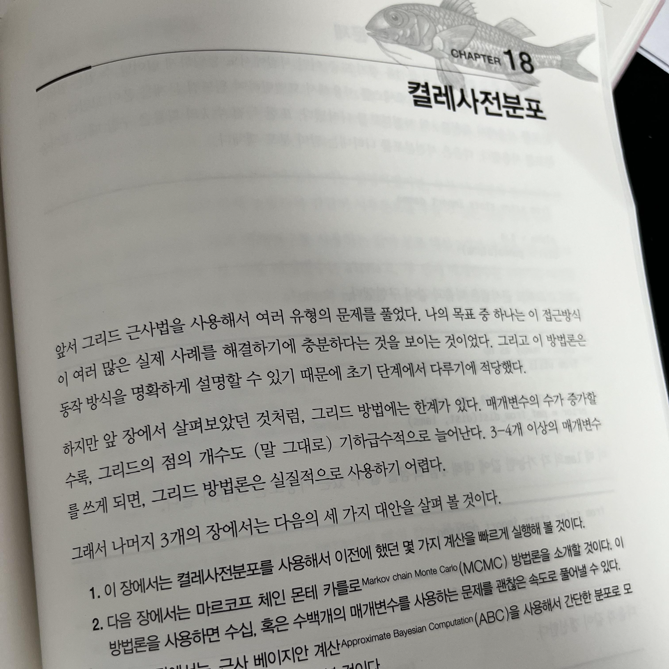 몇 가지 느낀 점은 대부분 영어를 안 쓰고 한국어로 되어 있는데 또 그렇게 어색하지는 않은 것 같다. 그리고 MCMC나 Approximate Bayesian까지 다루는 것을 보면 나름 전문적인 내용도 담고 있기에 정말 좋았다.